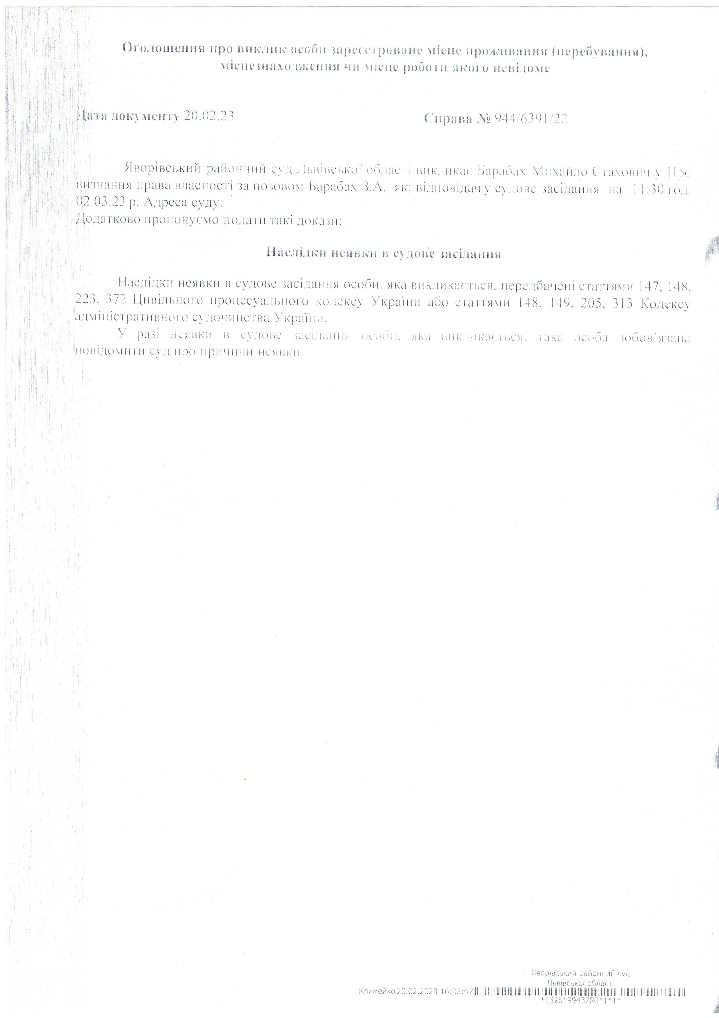 Виклик в якості відповідача Барабах Михайла Стаховича