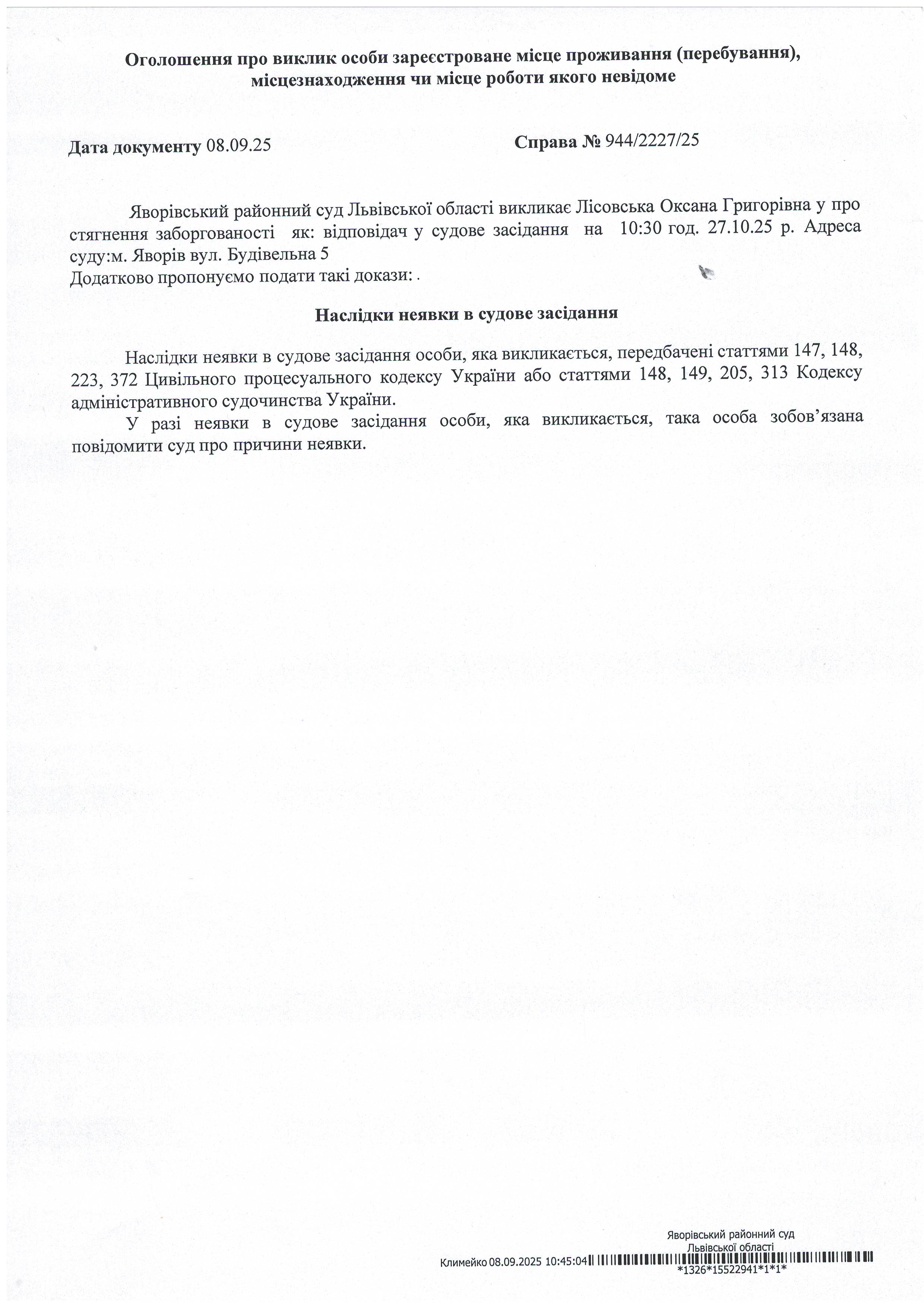 Виклик в якості відповідача Лісовську Оксану Григорівну