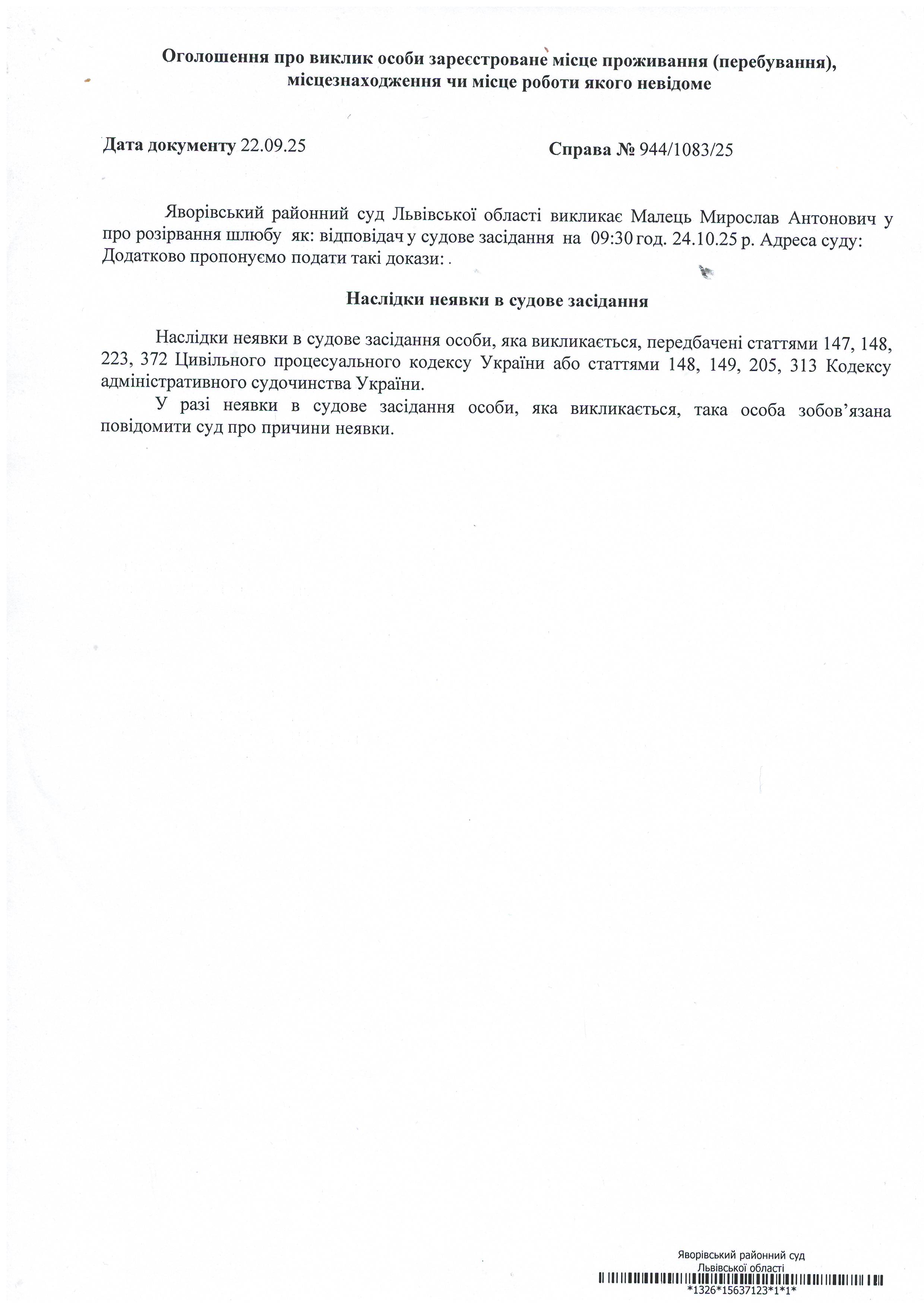 Виклик в якості відповідача Малець Мирослава Антоновича
