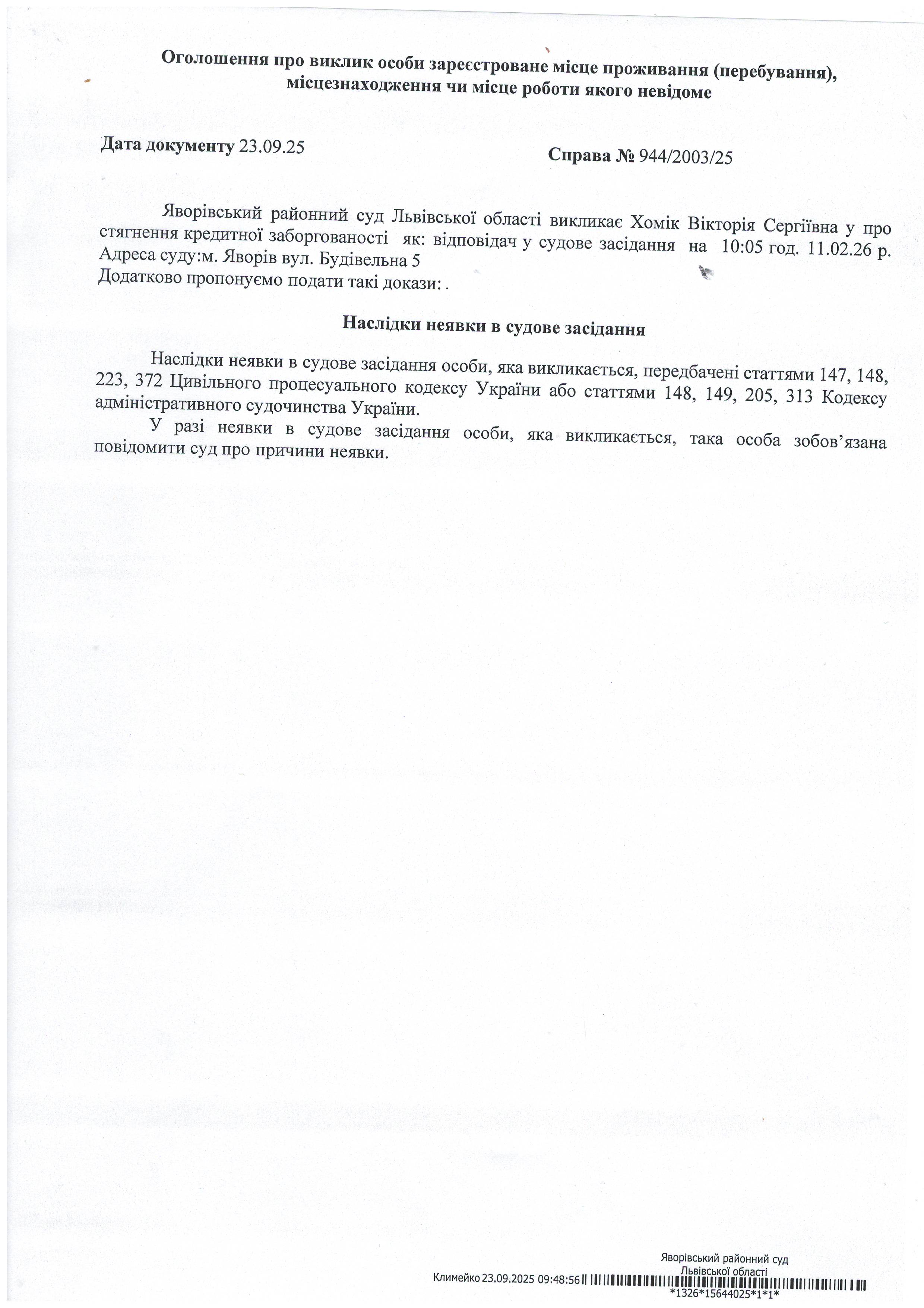 Виклик в якості відповідача Хоміка Віктора Сергійовича