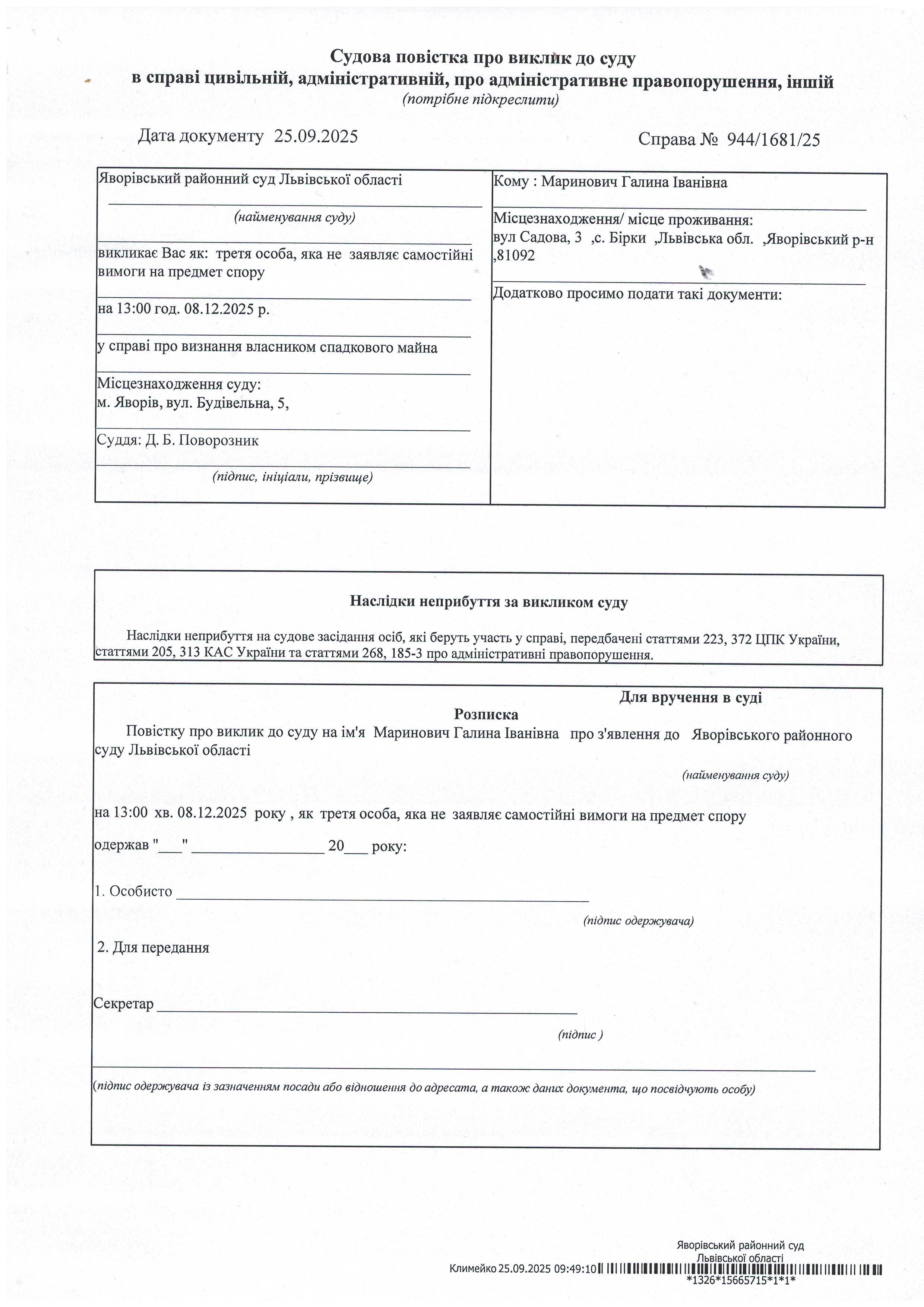 Виклик в якості третьої особи Маринович Галину Іванівну