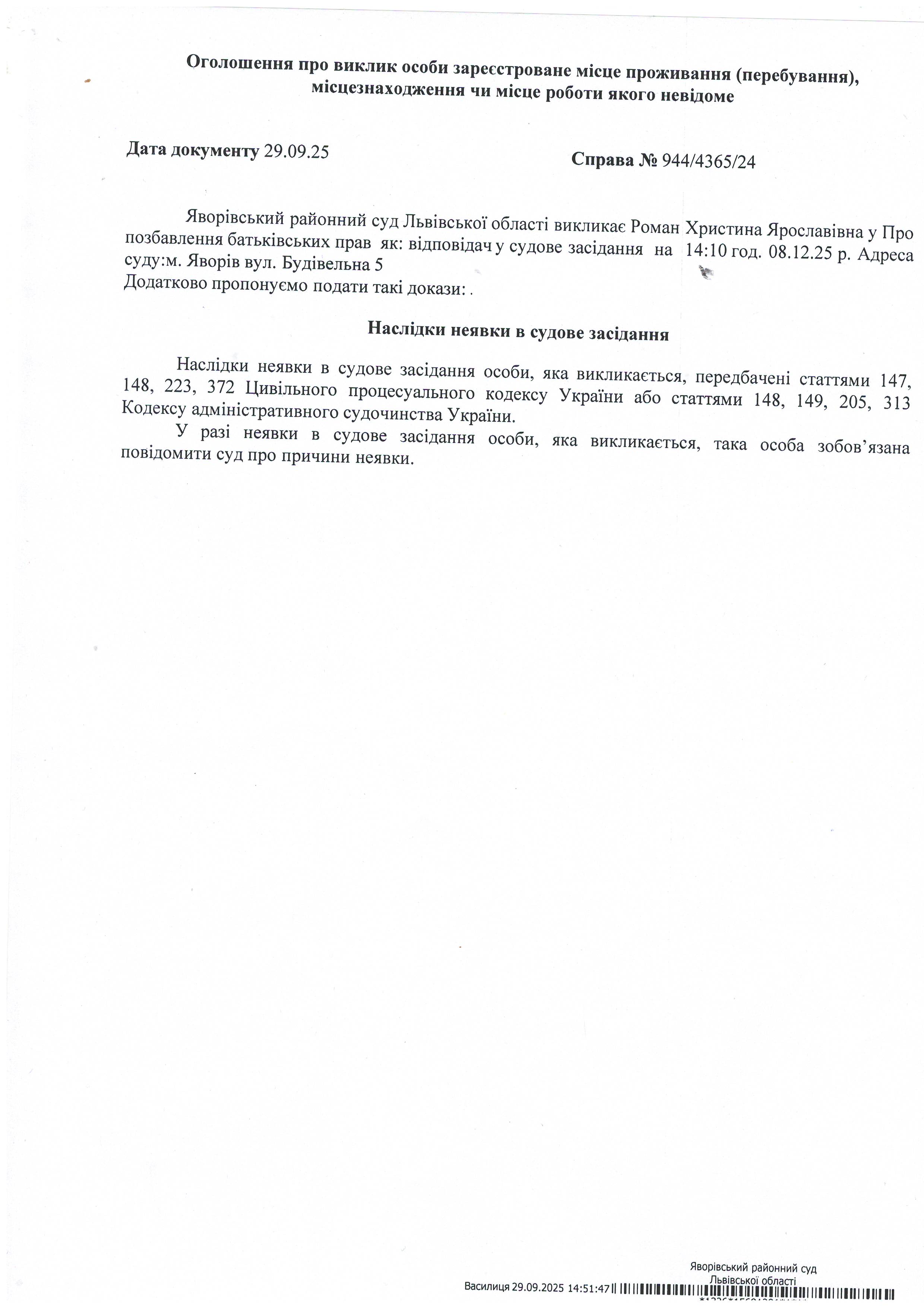 Виклик в якості відповідача Роман Христини Ярославівни