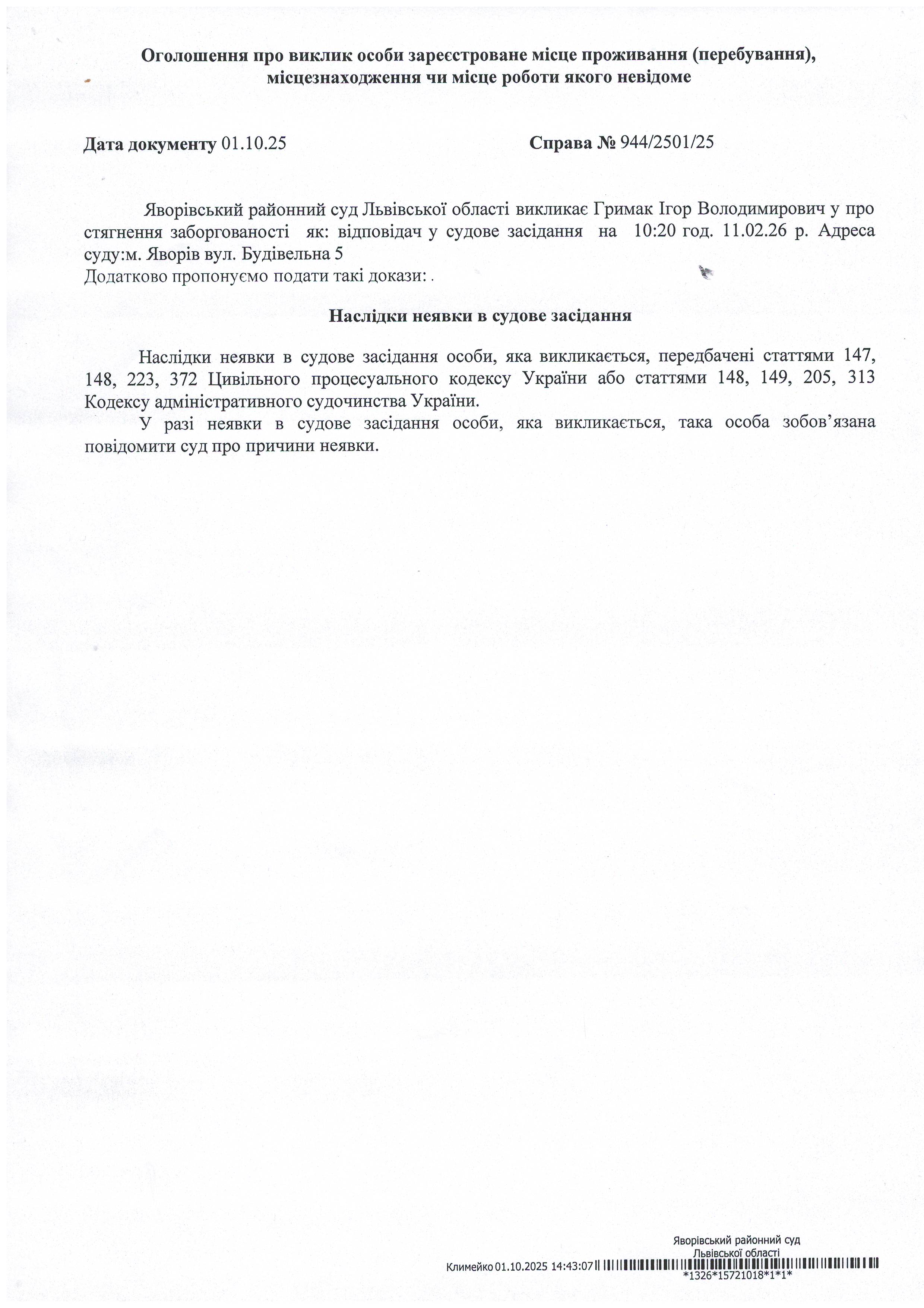 Виклик в якості відповідача Гримак Ігоря Володимировича