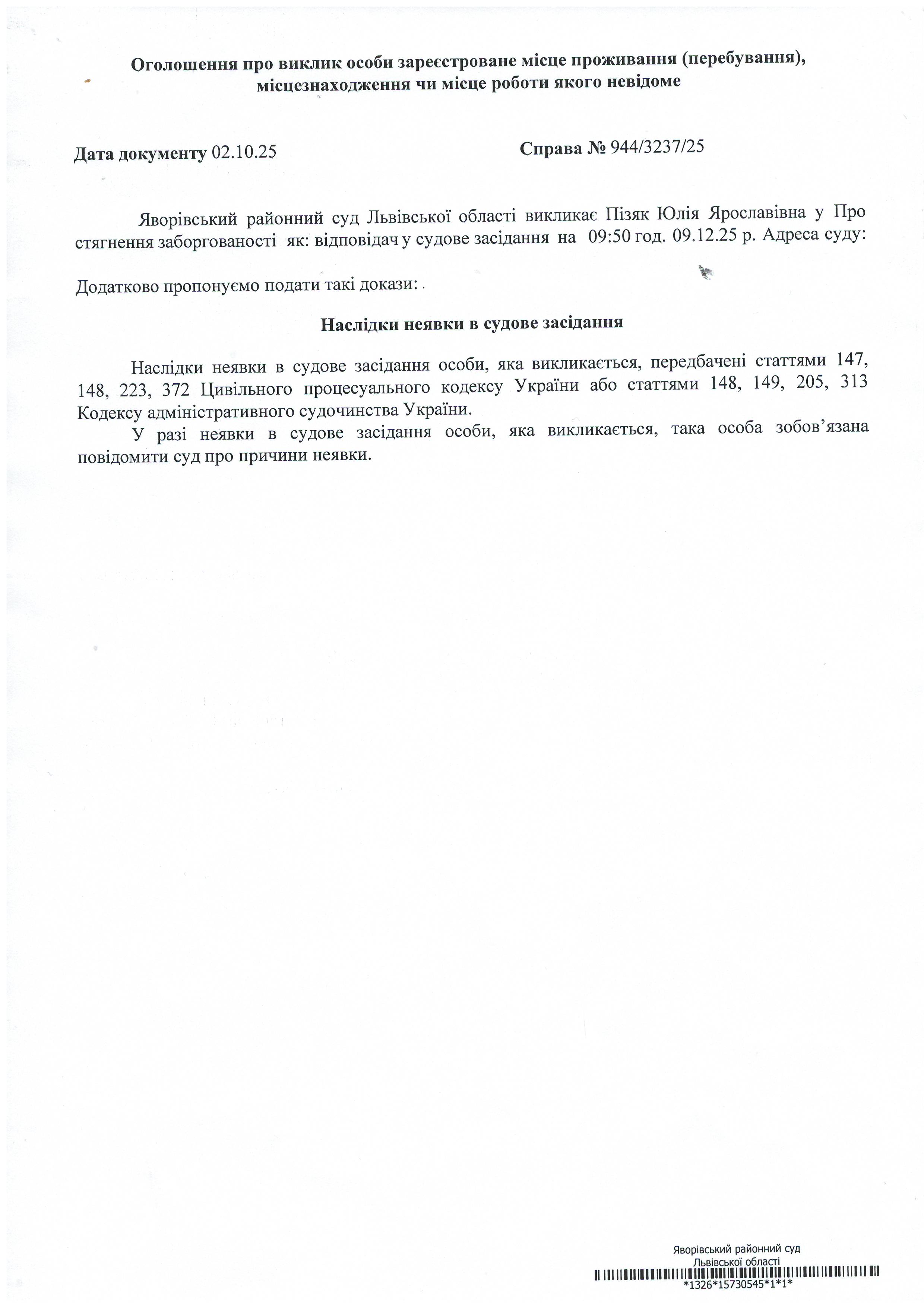 Виклик в якості відповідача Пізяк Юлію Ярославівну