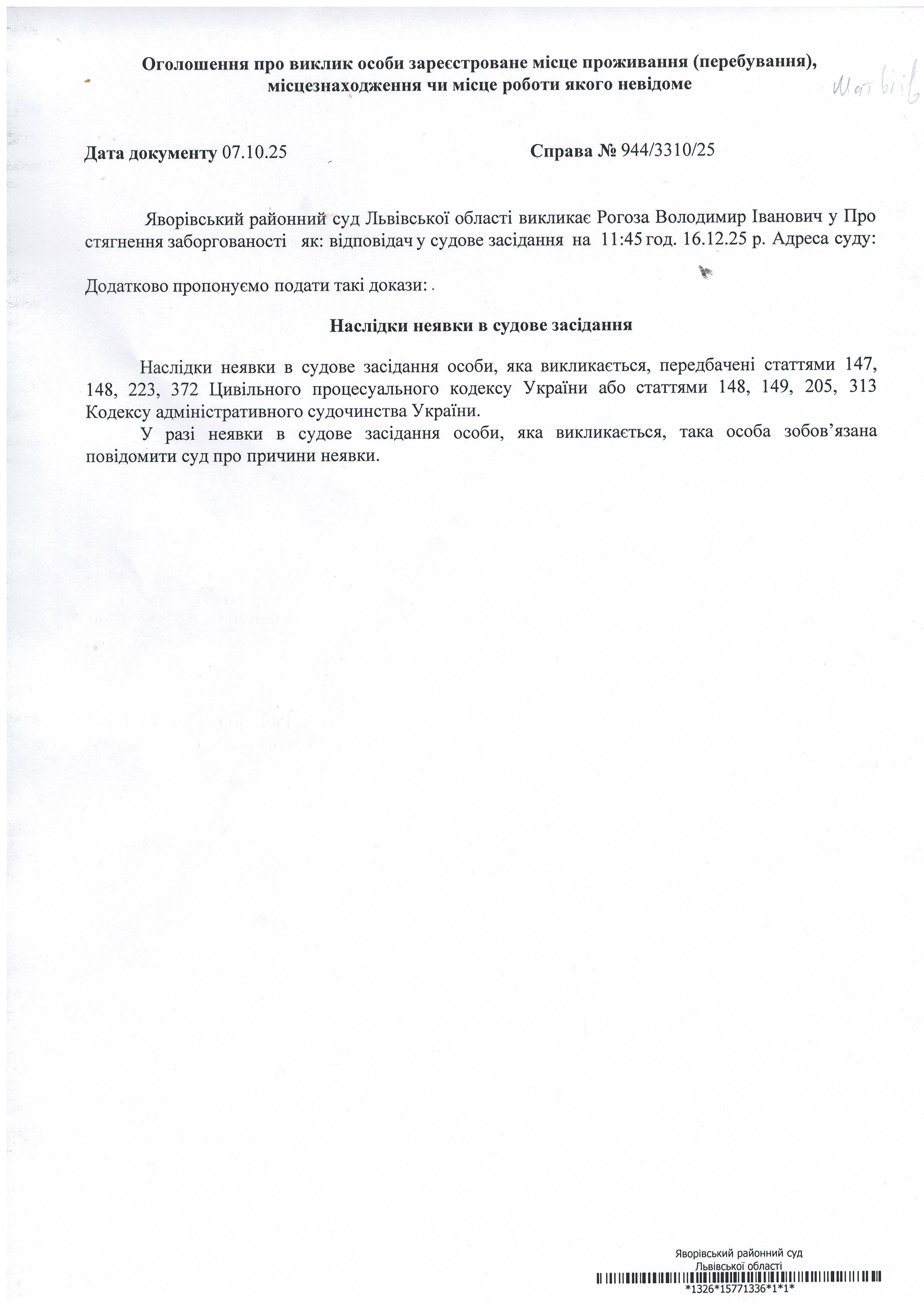 Виклик в якості відповідача Рогоза Володимира Івановича