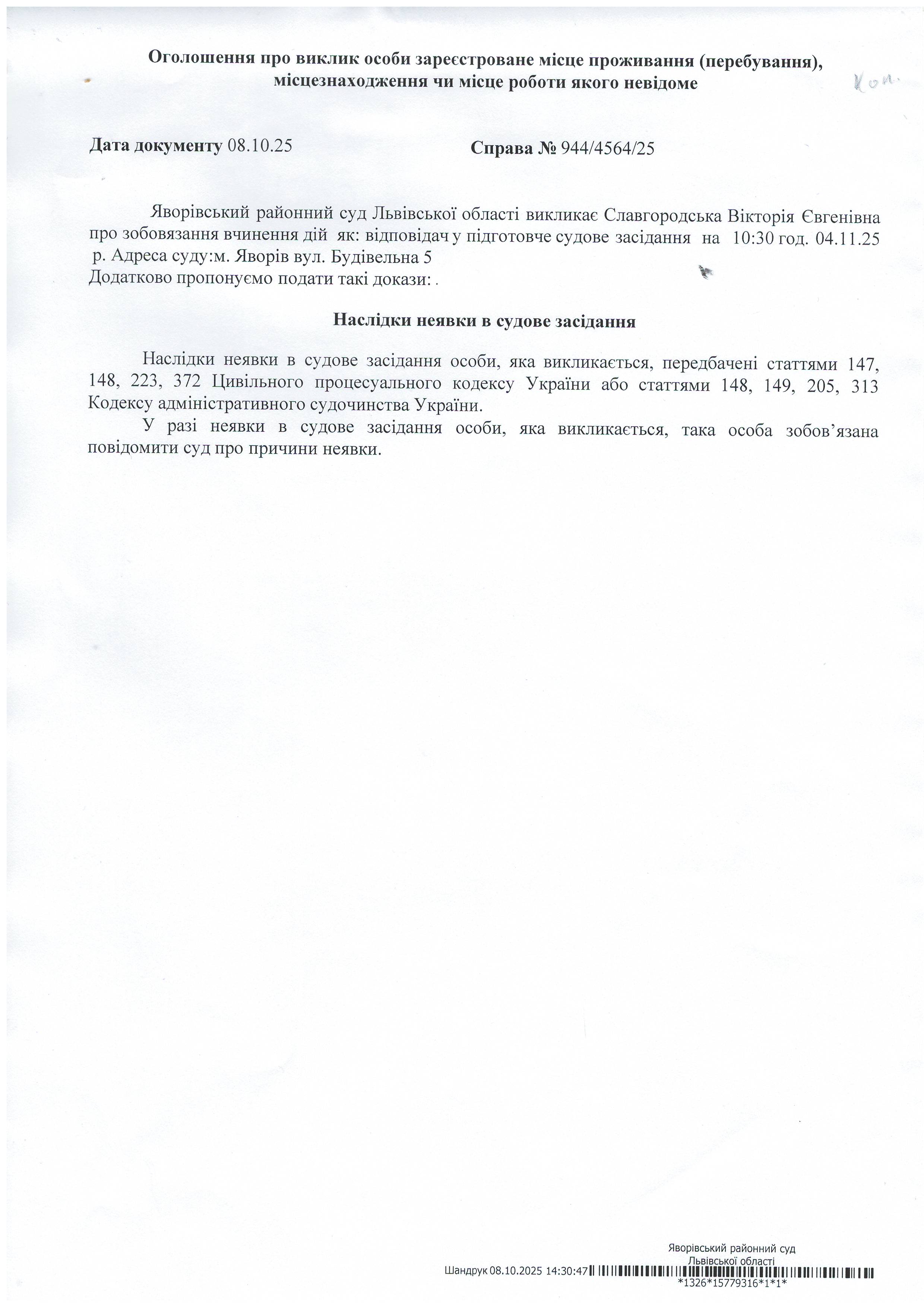 Виклик в якості відповідача Славгородську Вікторію Євгенівну