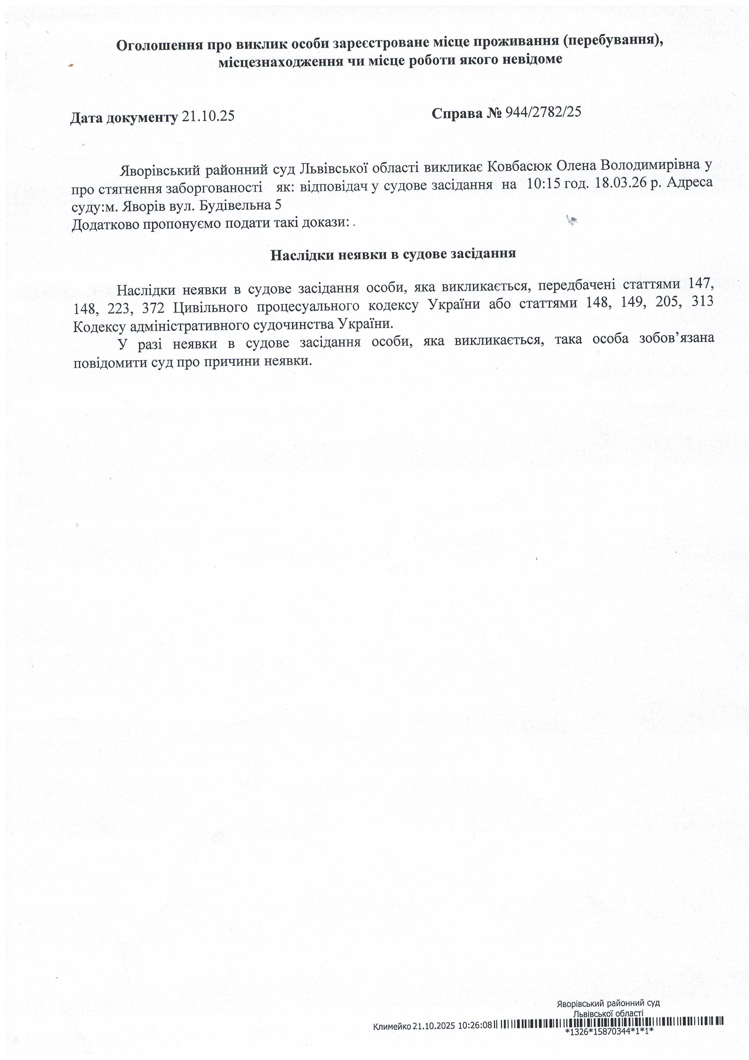 Виклик в якості відповідача Ковбасюк Олени Володимирівни