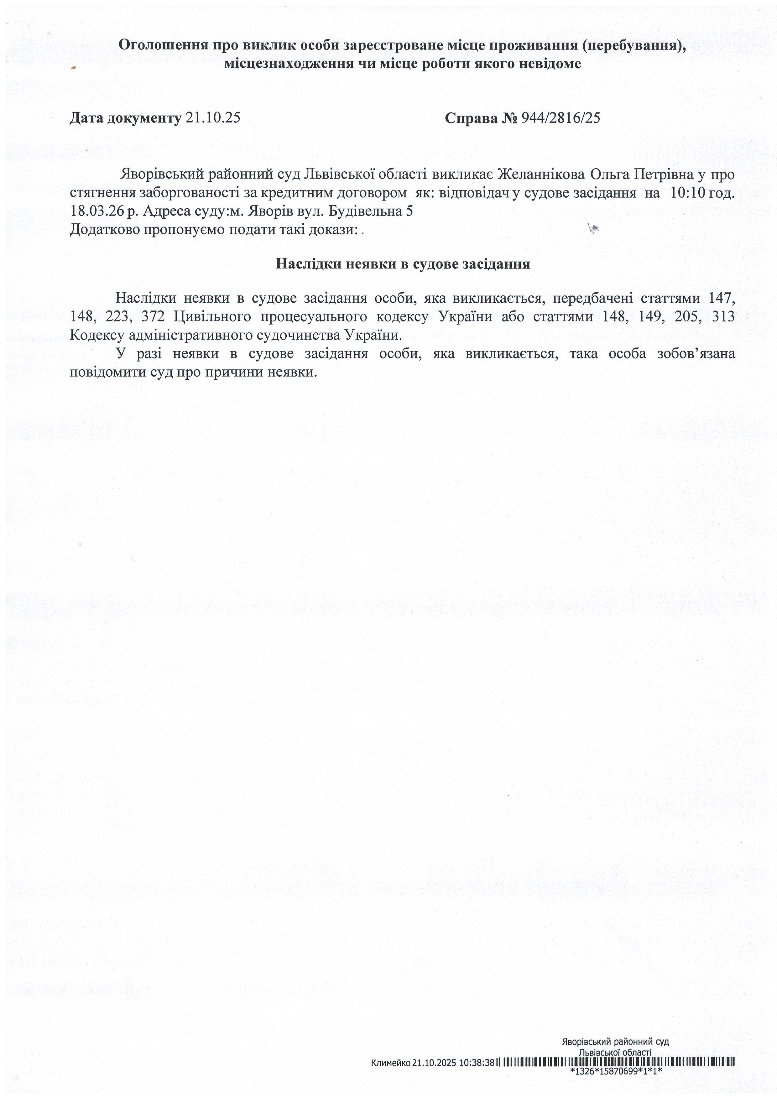 Виклик в якості відповідача Желаннікову Ольгу Петрівну