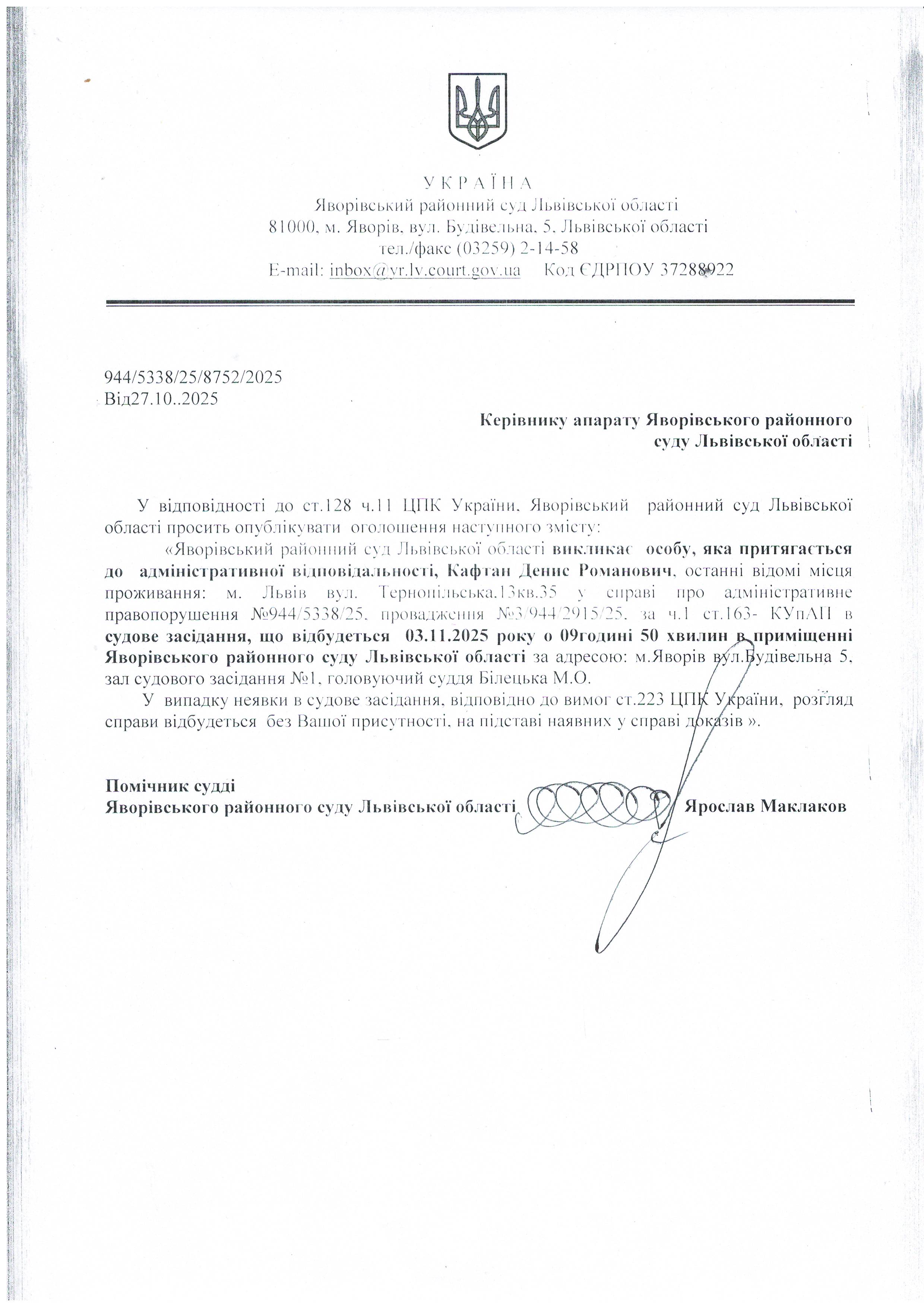 Виклик в якості особи, яка притягається до адміністративної відповідальності Кафтан Дениса Романовича