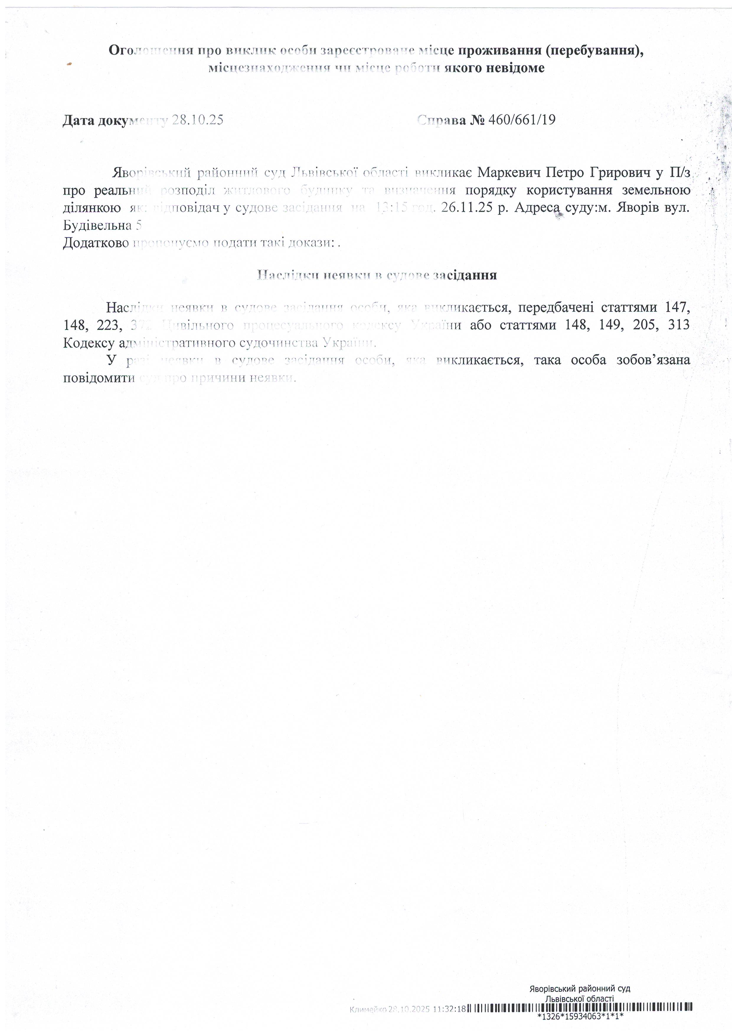 Виклик в якості відповідача Маркевич Петра Григоровича