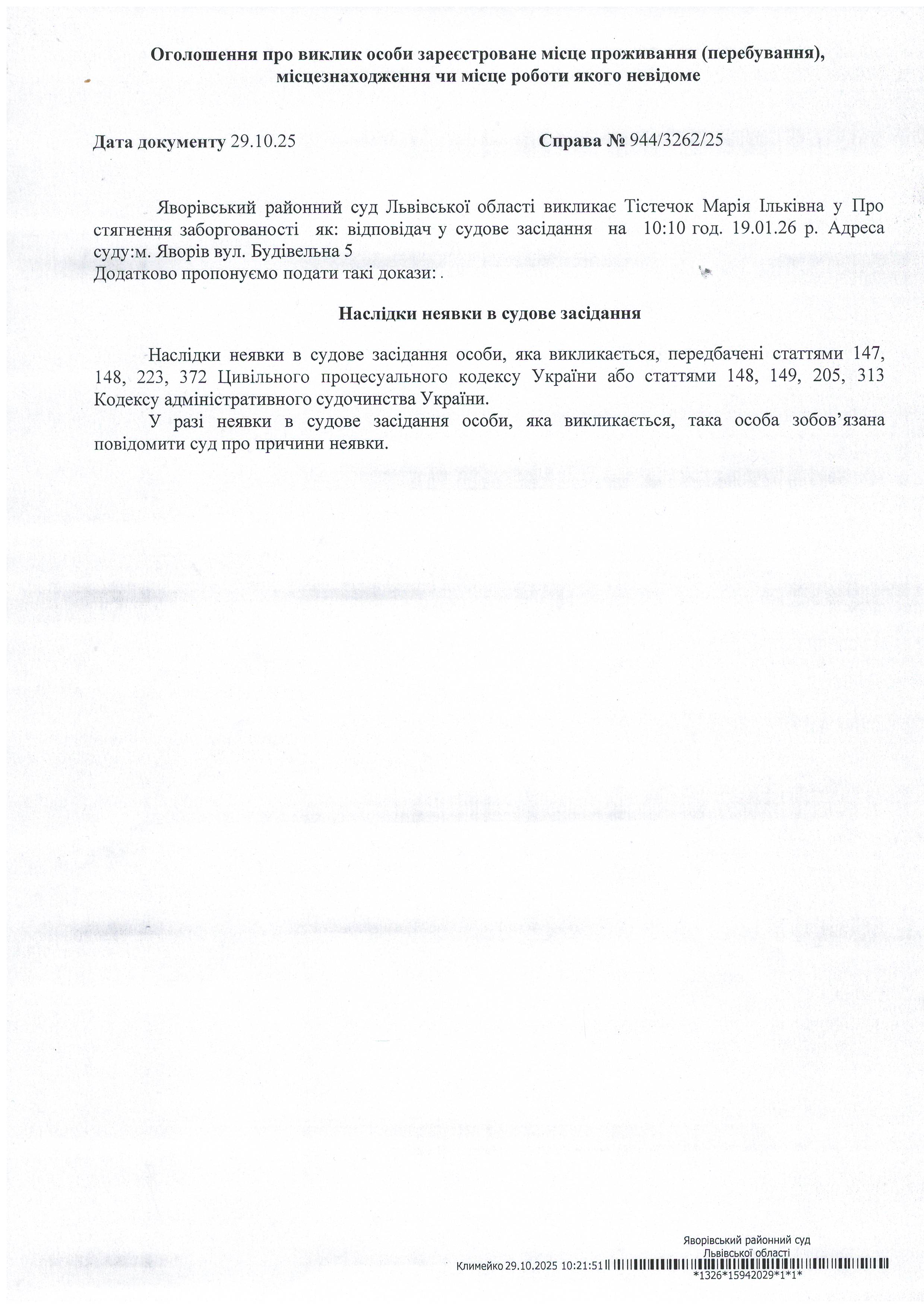 Виклик в якості відповідача Тістечок Марію Ільківну