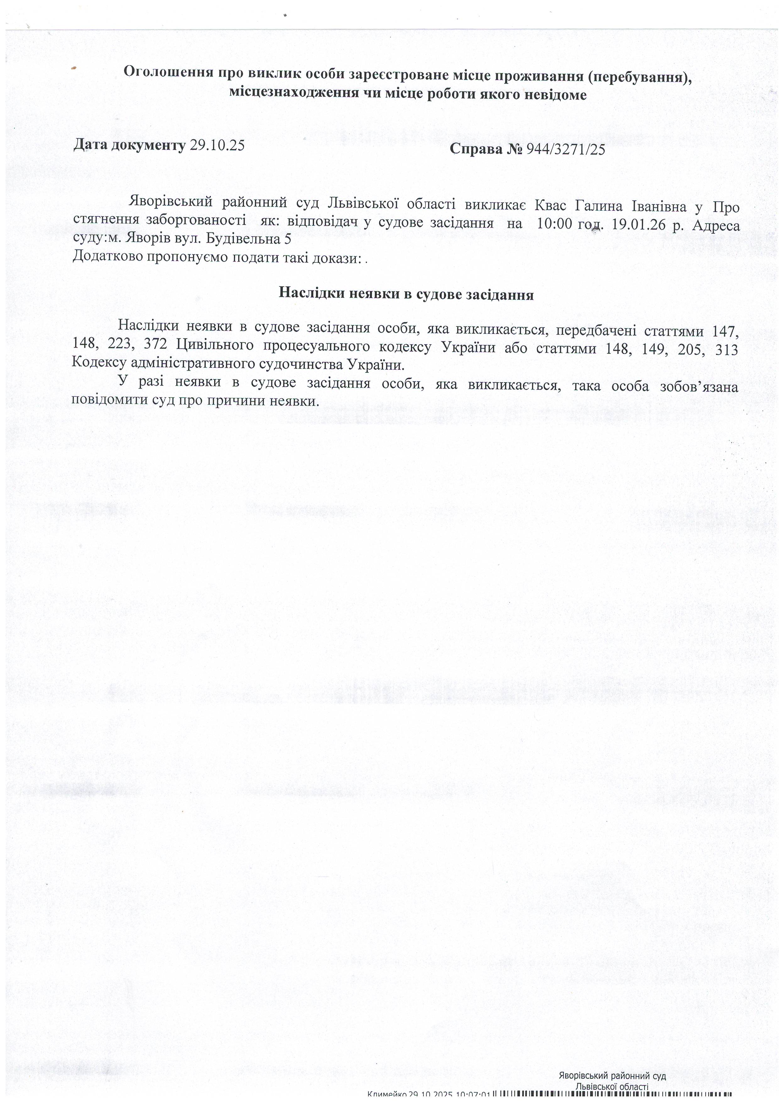 Виклик в якості відповідача Квас Галину Іванівну
