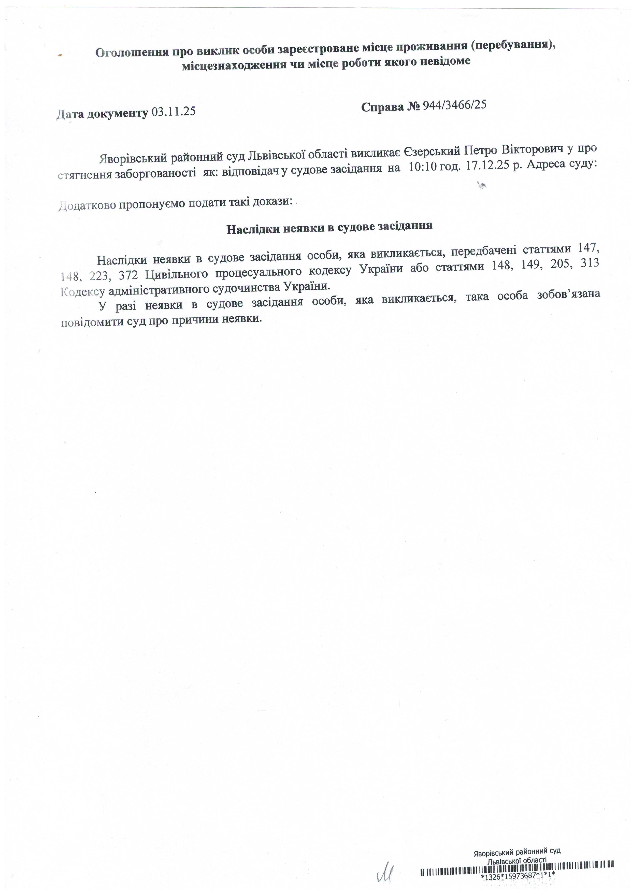 Виклик в якості відповідача Єзерського Петра Вікторовича
