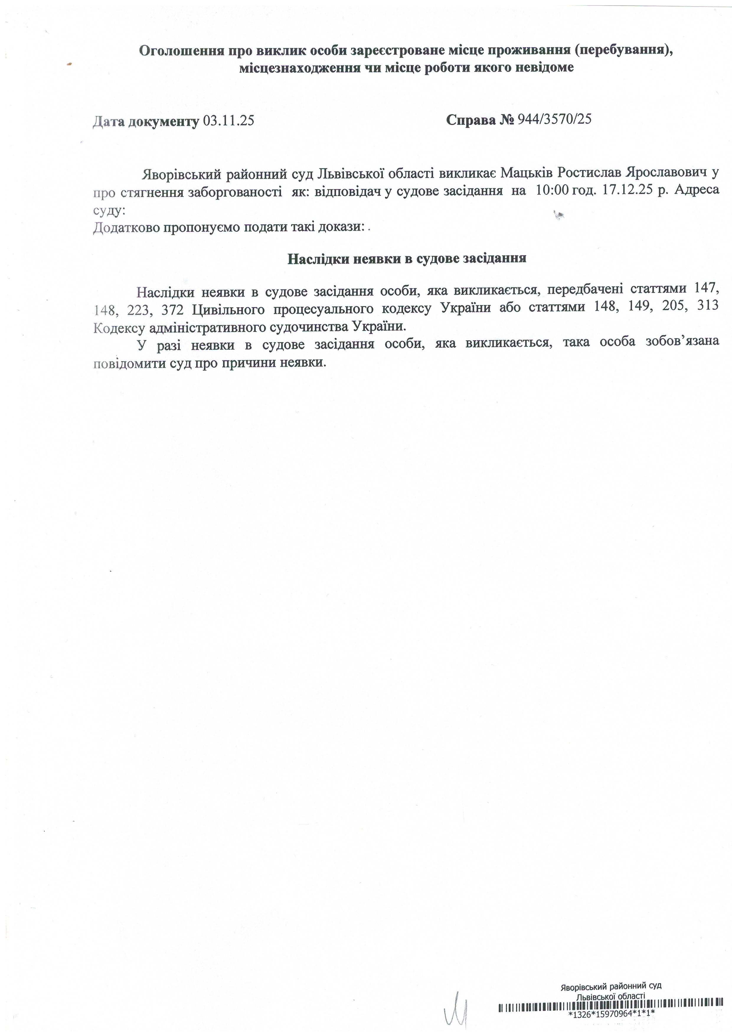Виклик в якості відповідача Мацьків Ростислава Ярославовича