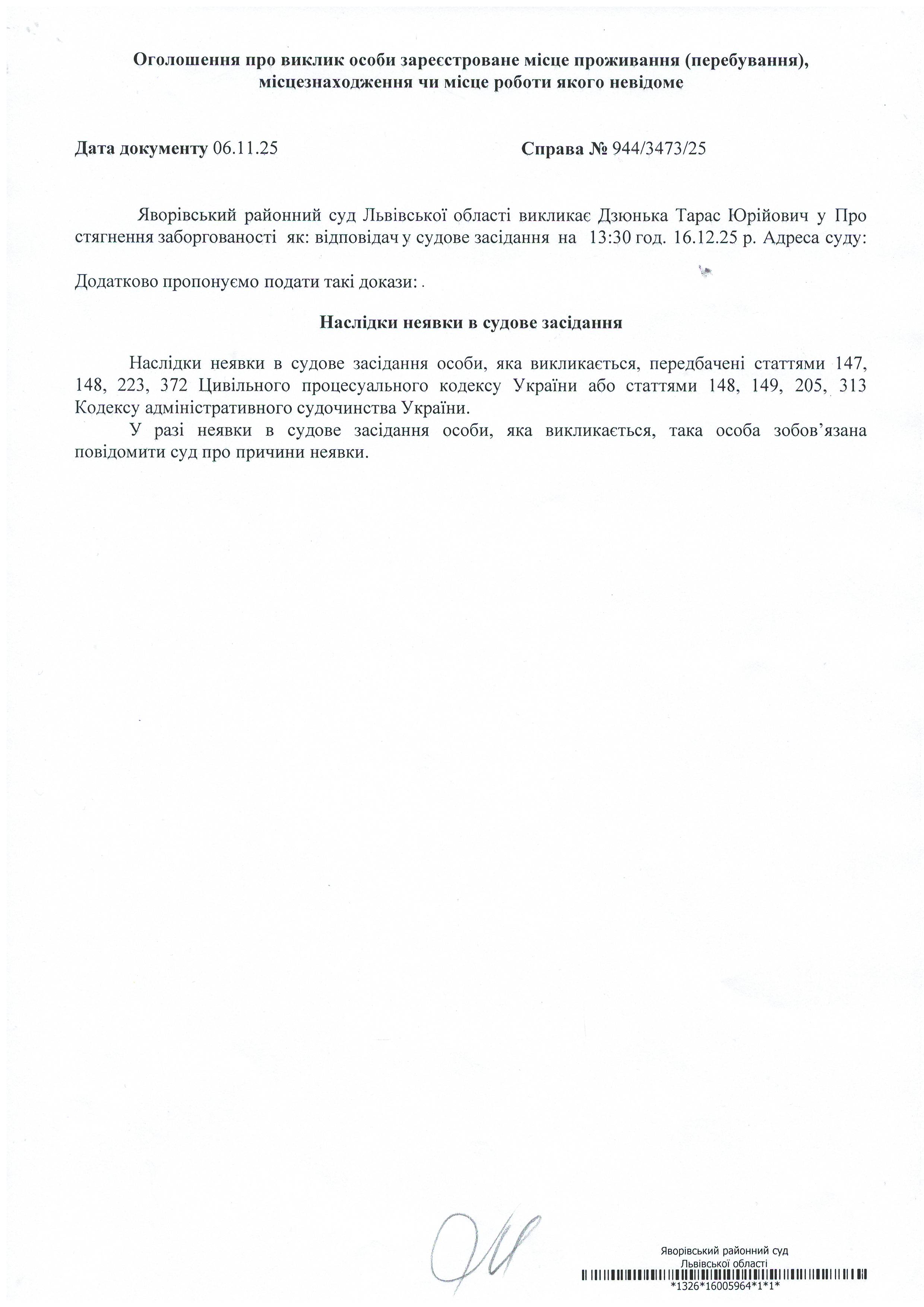 Виклик в якості відповідача Дзюнька Тараса Юрійовича