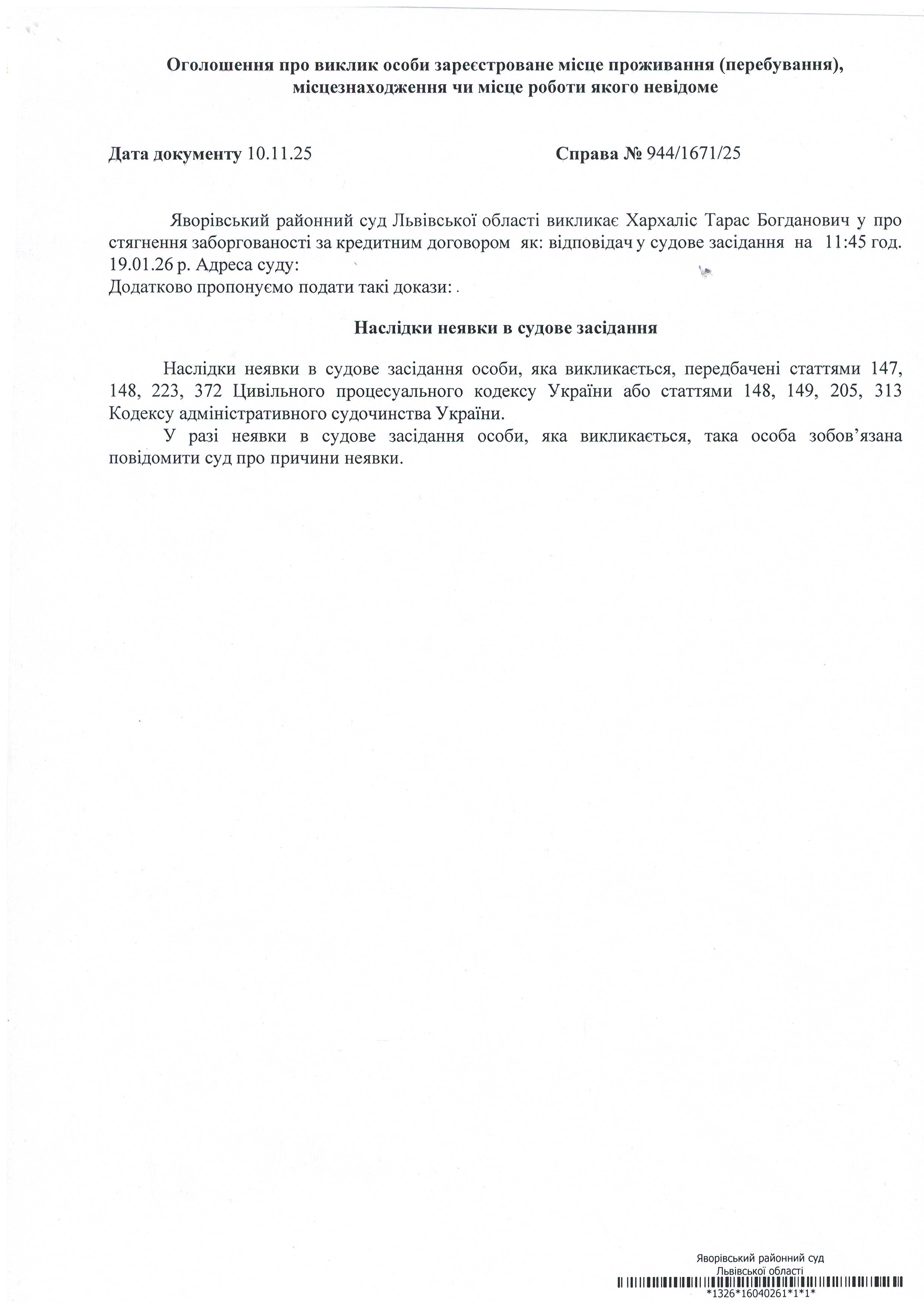 Виклик в якості відповідача Хархаліс Тараса Богдановича