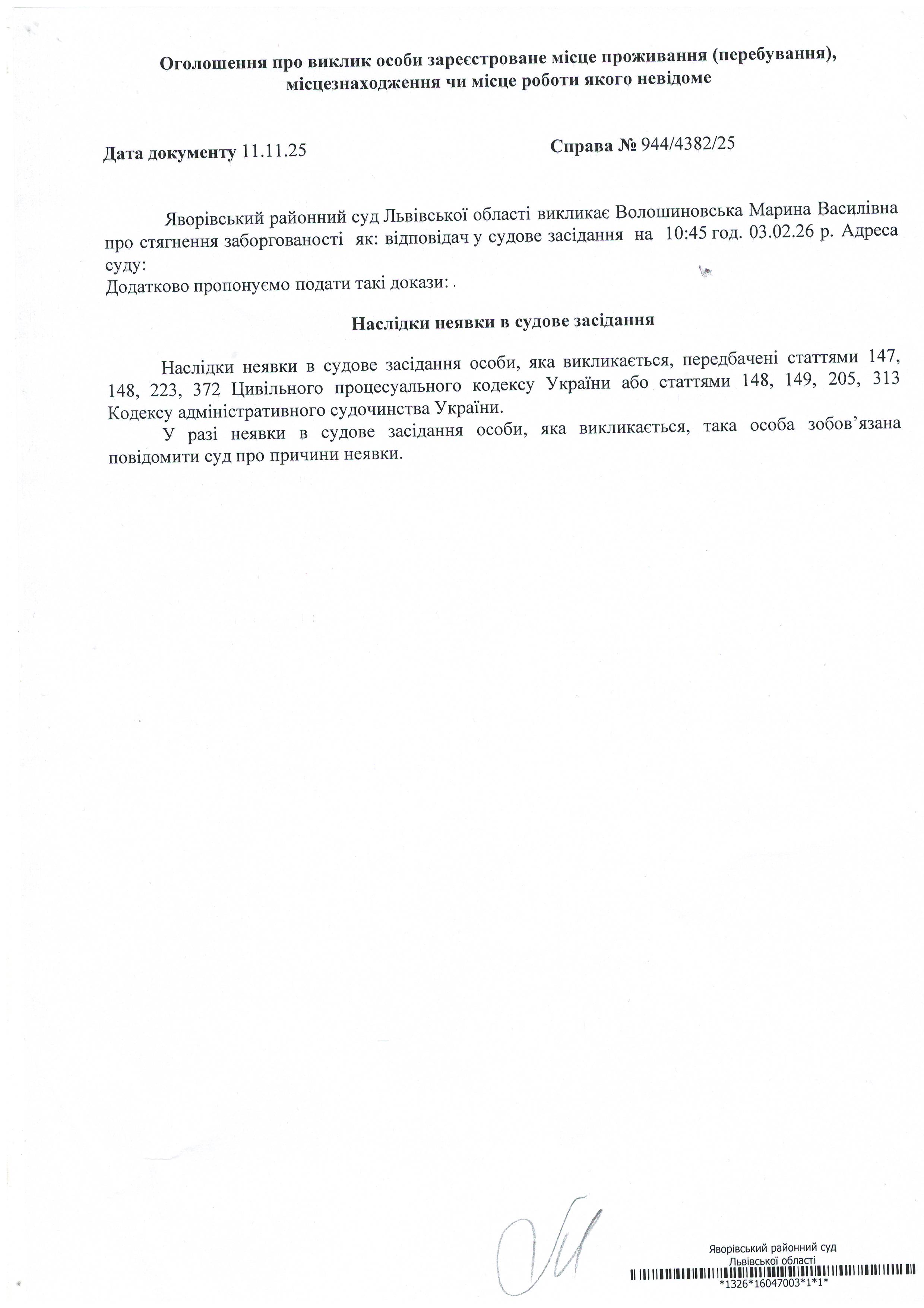 Виклик в якості відповідача Волошиновську Марину Василівну