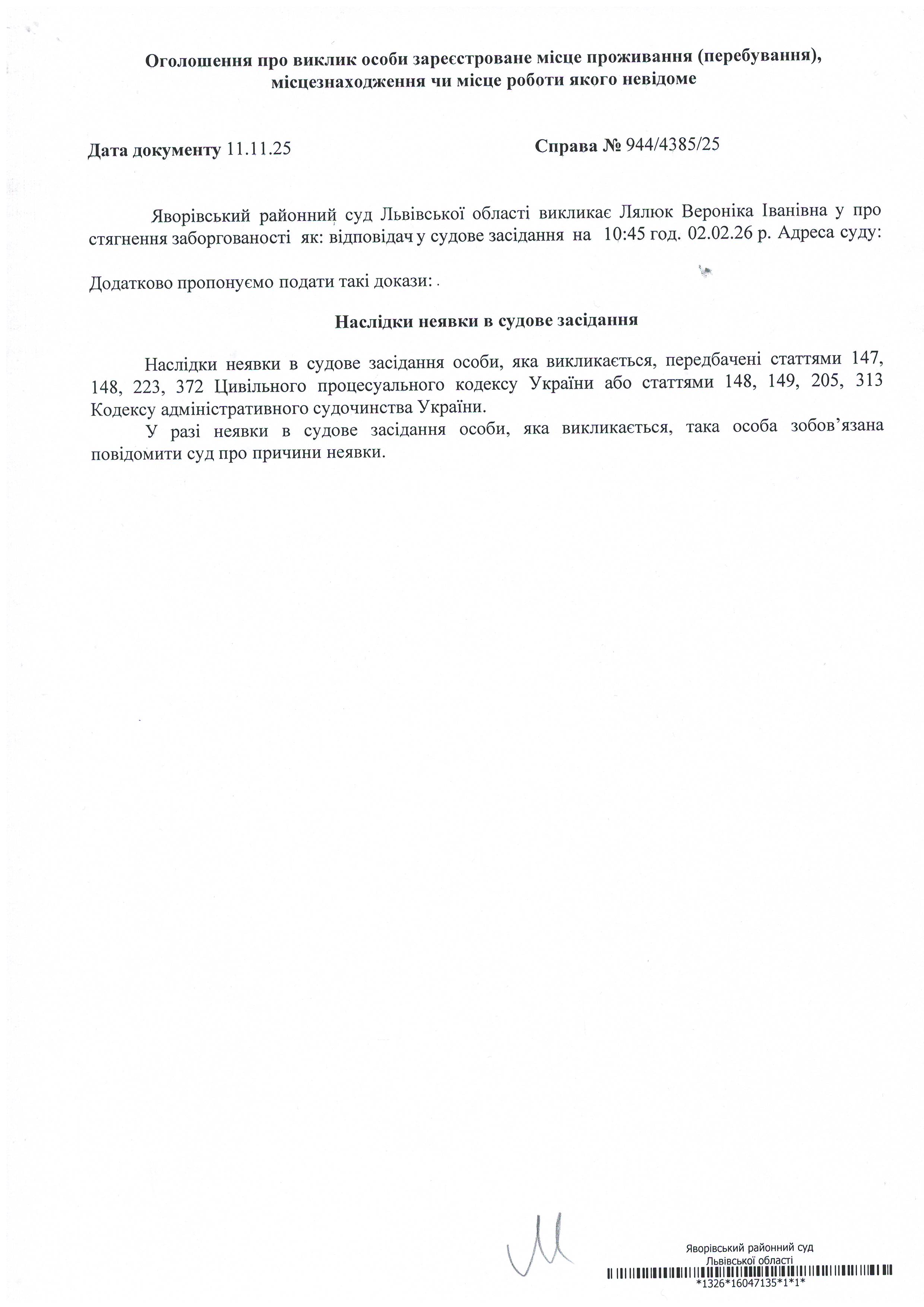 Виклик в якості відповідача Лялюк Вероніку Іванівну