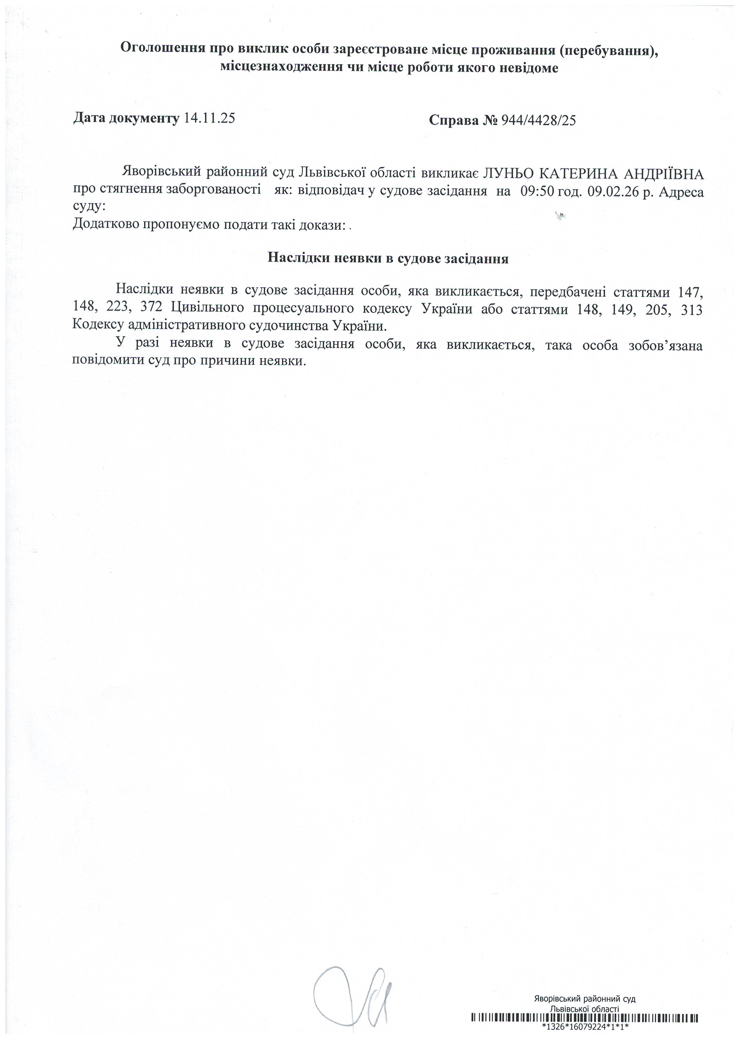 Виклик в якості відповідача Луньо Катерину Андріївну