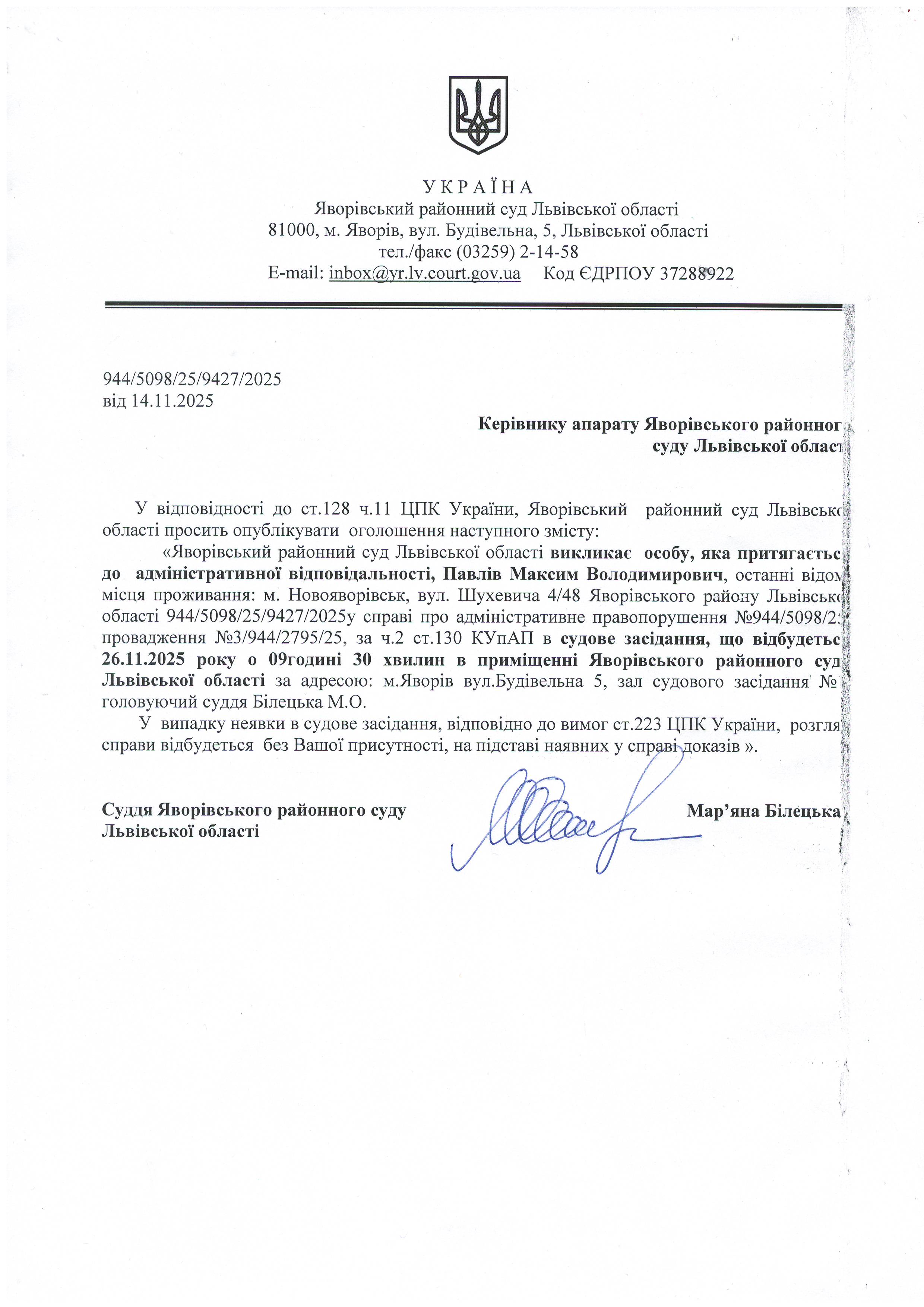 Виклик в якості особи, яка притягається до адміністративної відповідальності Павлів Максима Володимировича