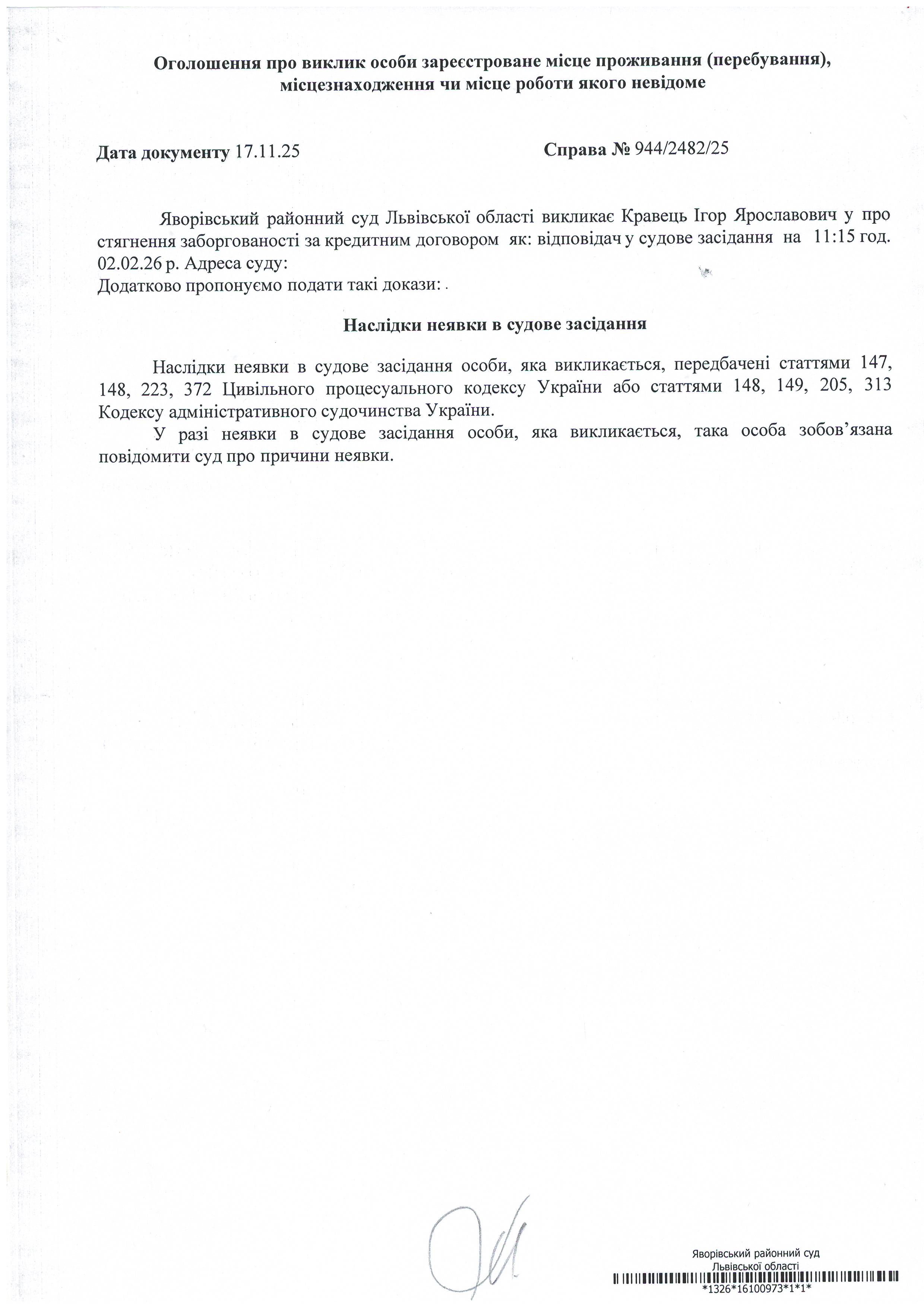 Виклик в якості відповідача Кравець Ігоря Ярославовича