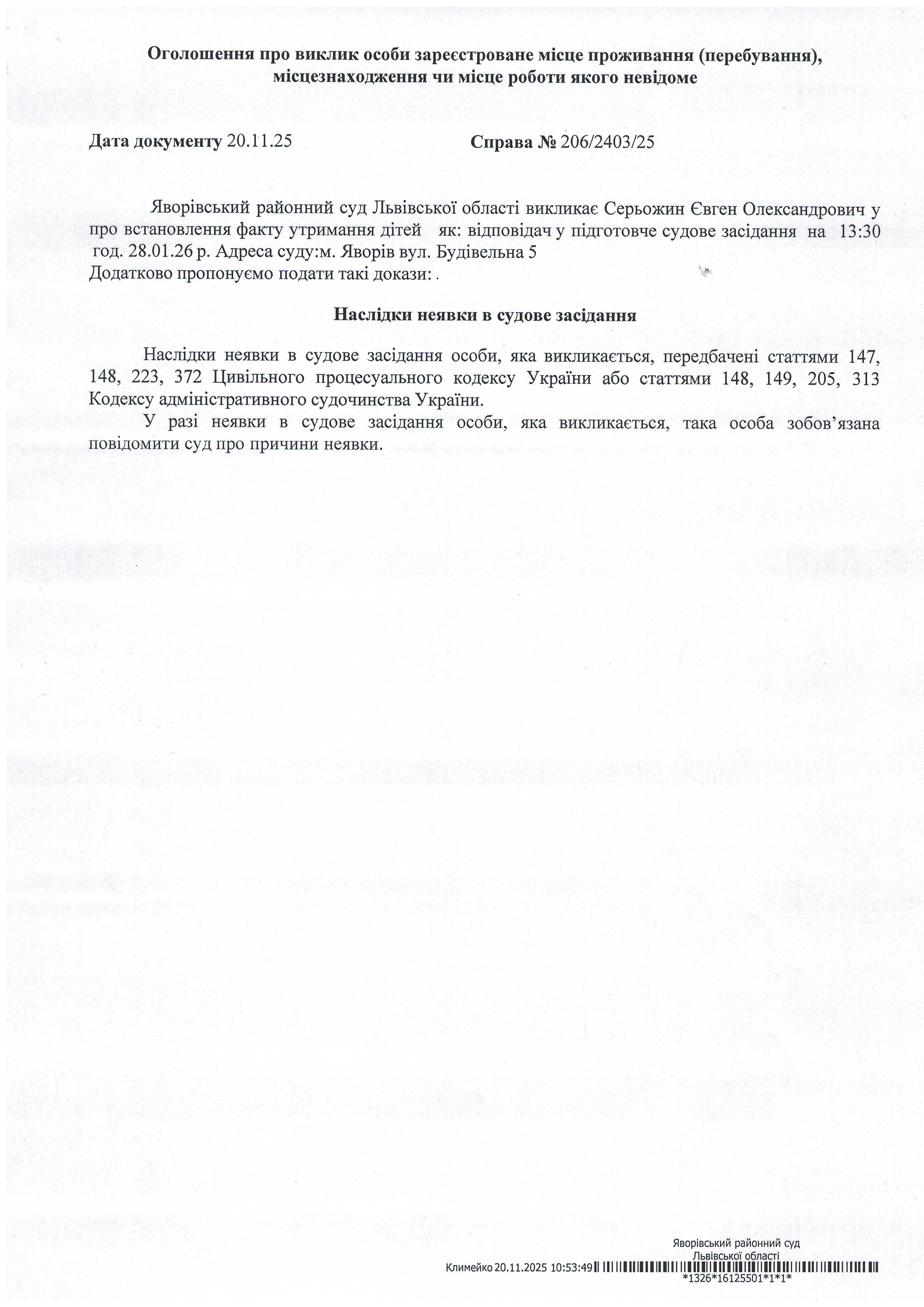 Виклик в якості відповідача Серьожина Євгена Олександровича