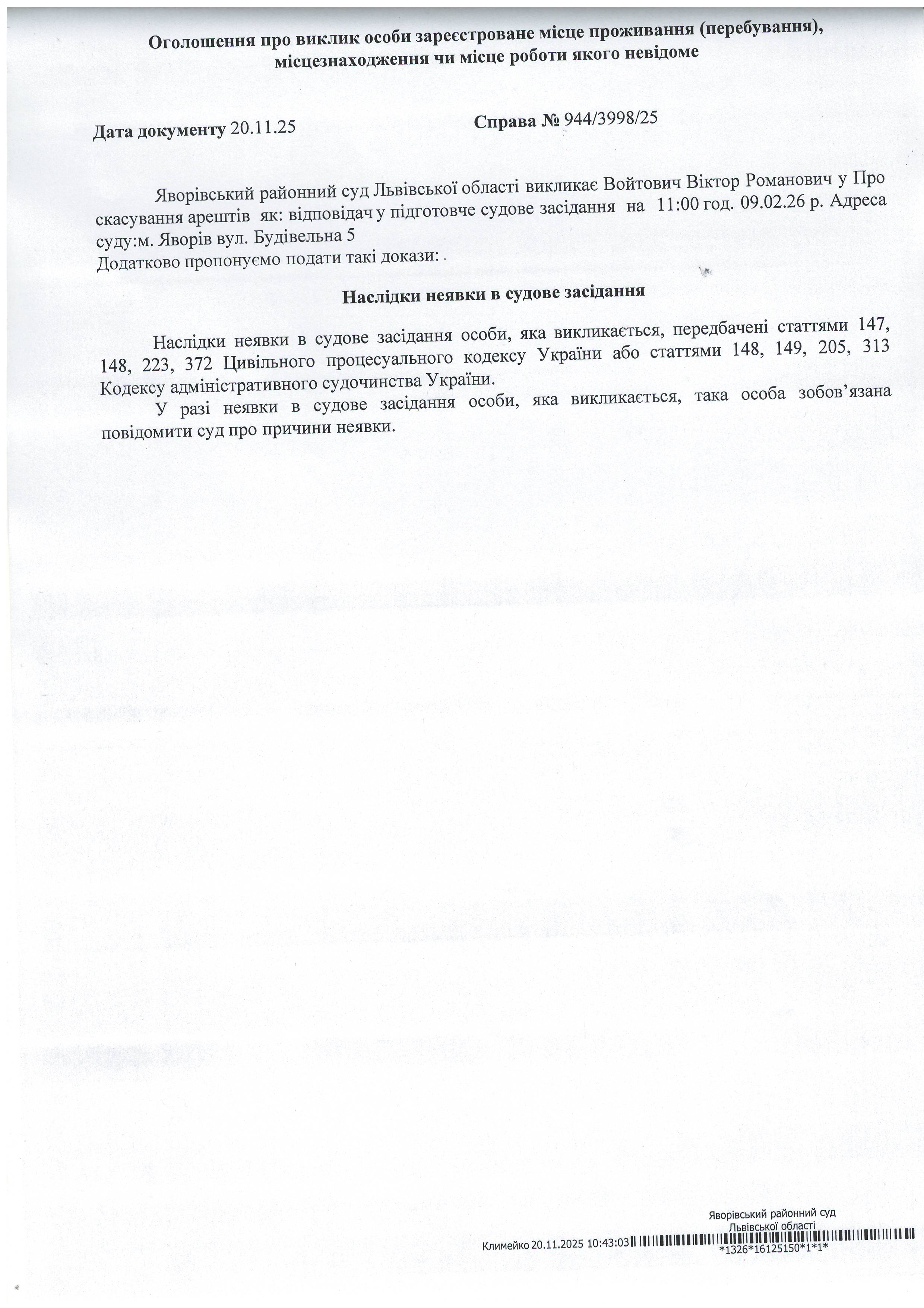 Виклик в якості відповідача Войтович Віктора Романовича