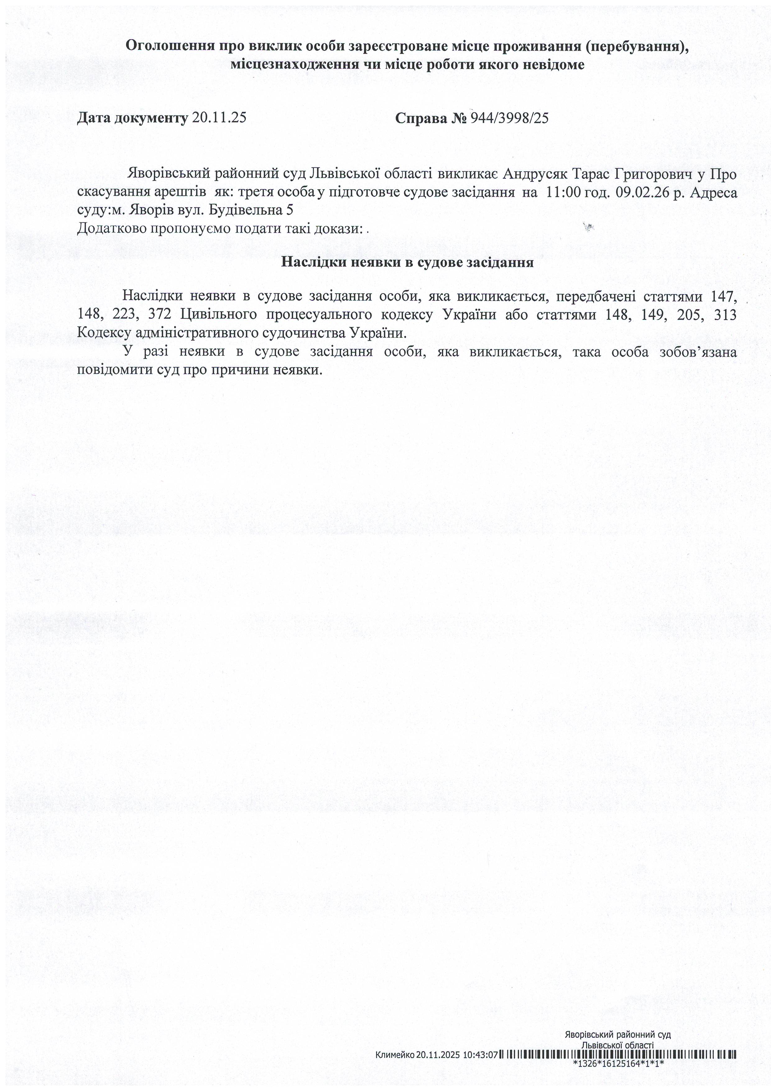 Виклик в якості відповідача Андрусяк Тараса Григоровича