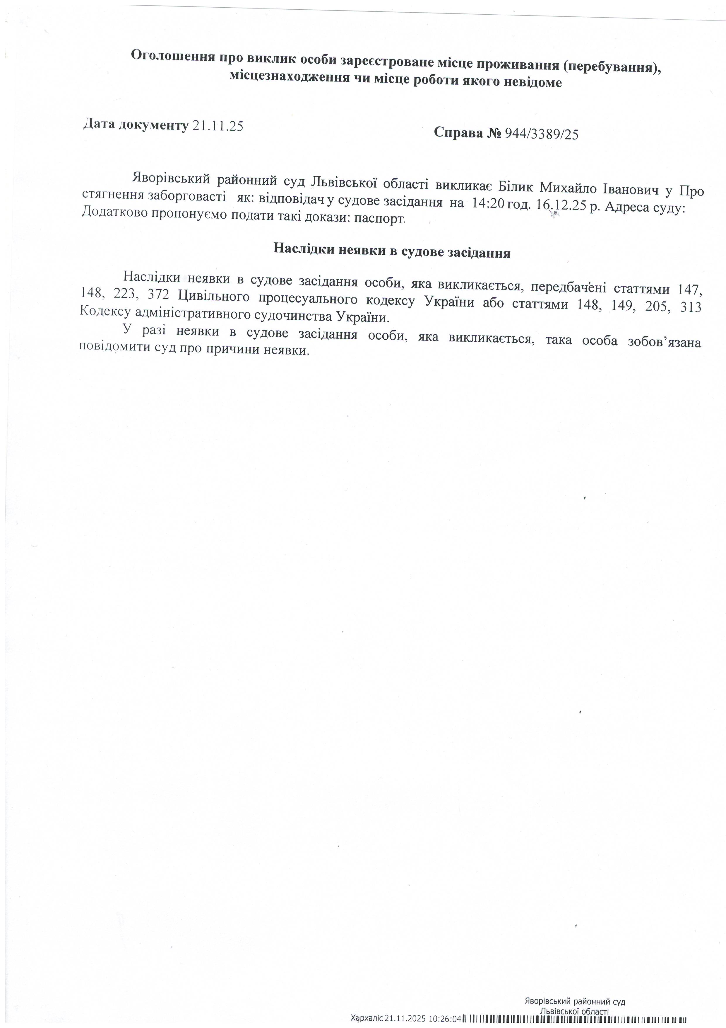 Виклик в якості відповідача Білика Михайла Івановича