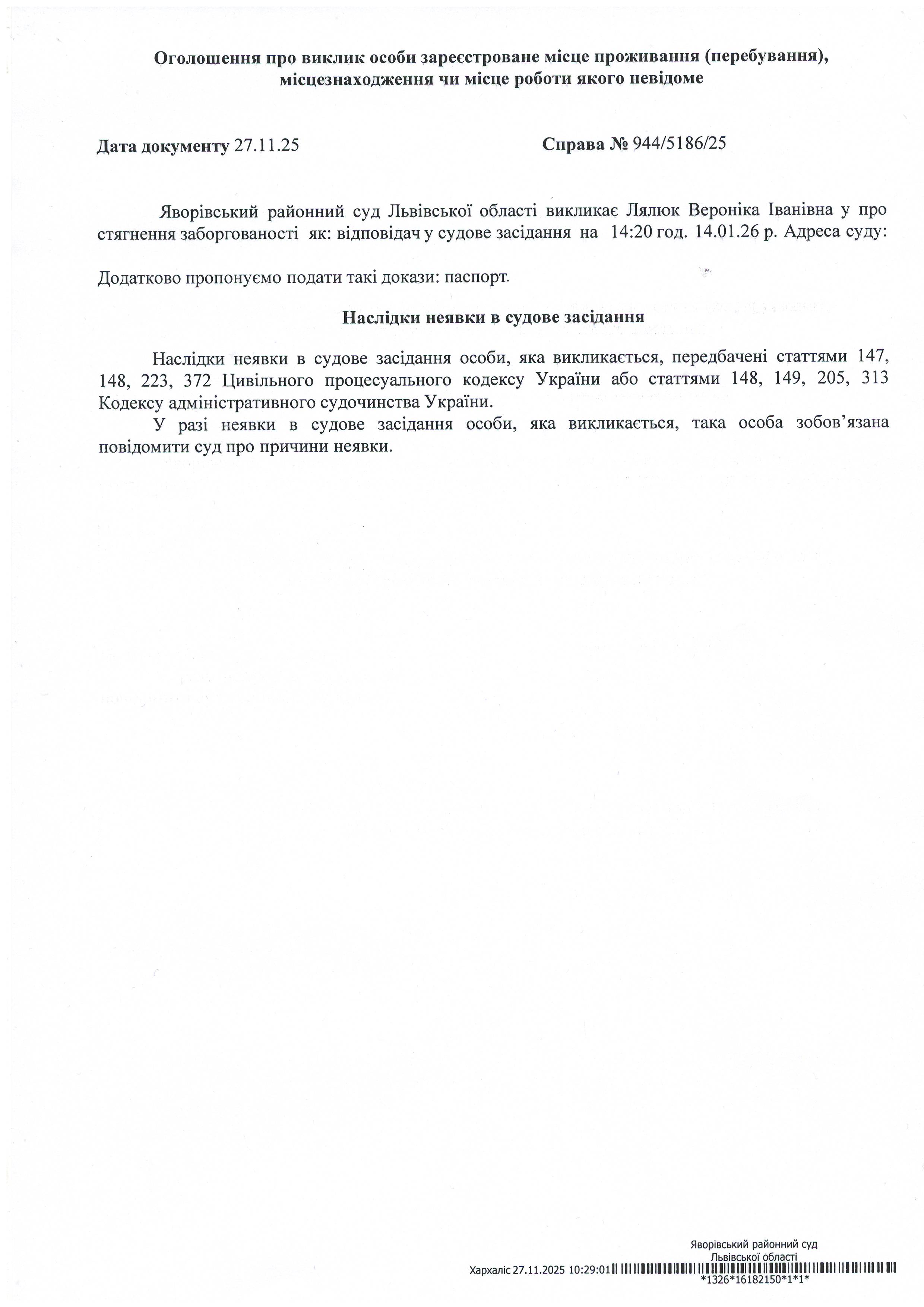 Виклик в якості відповідача Лялюк Вероніки Іванівни