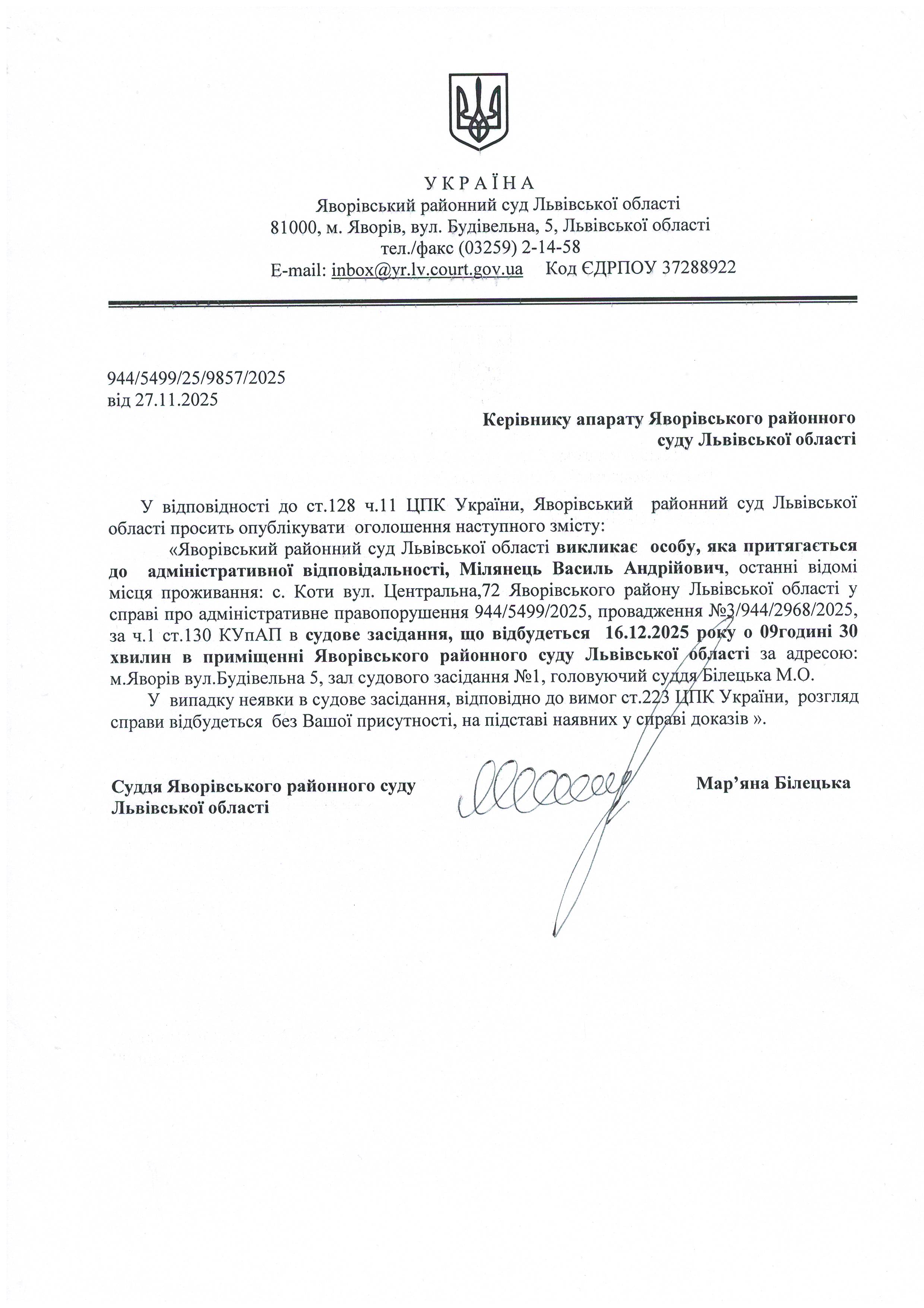 Виклик особи яка притягається до адміністративної відповідальності Мілянець Василя Андрійовича