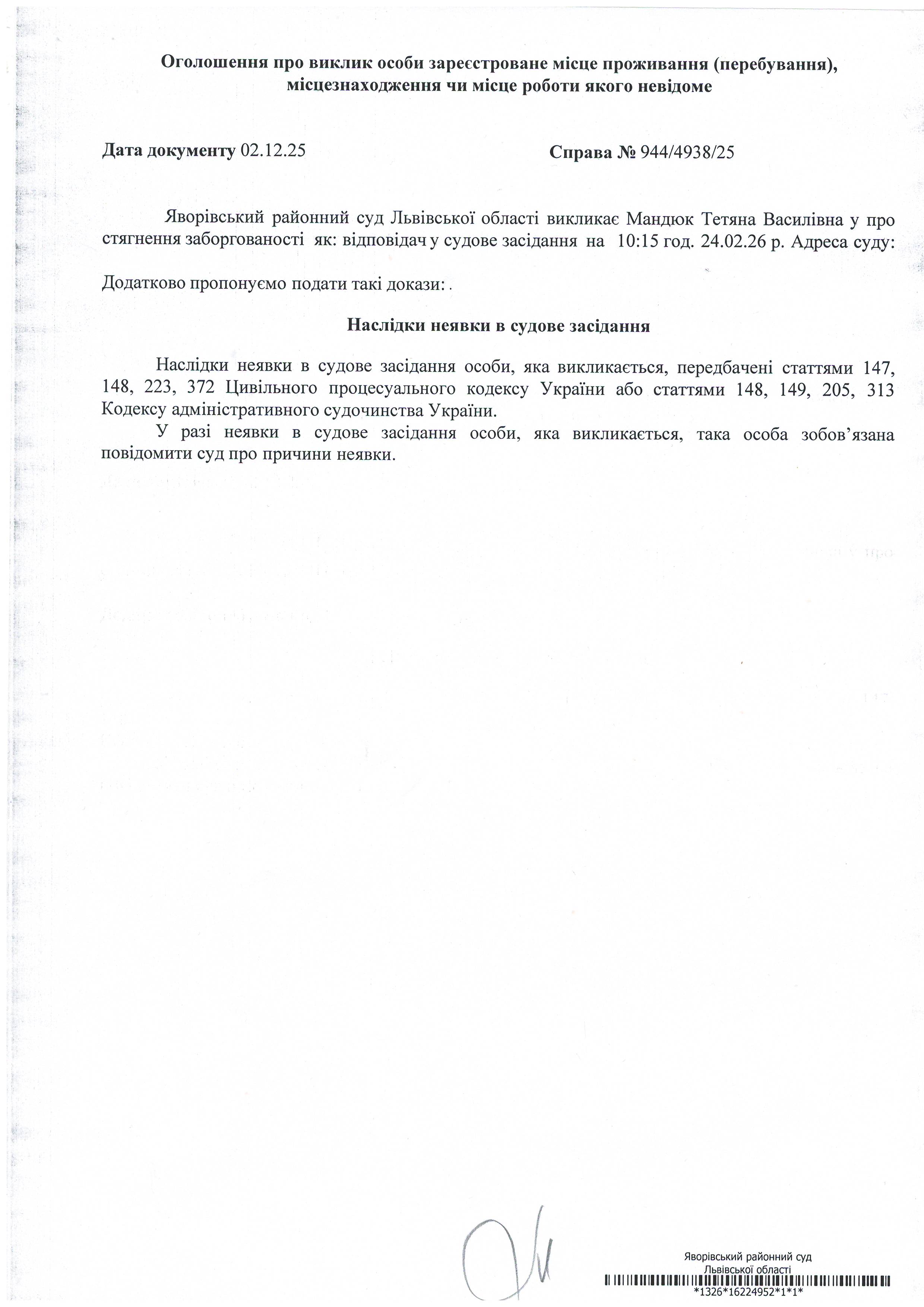 Виклик в якості відповідача Мандюк Тетяну Василівну