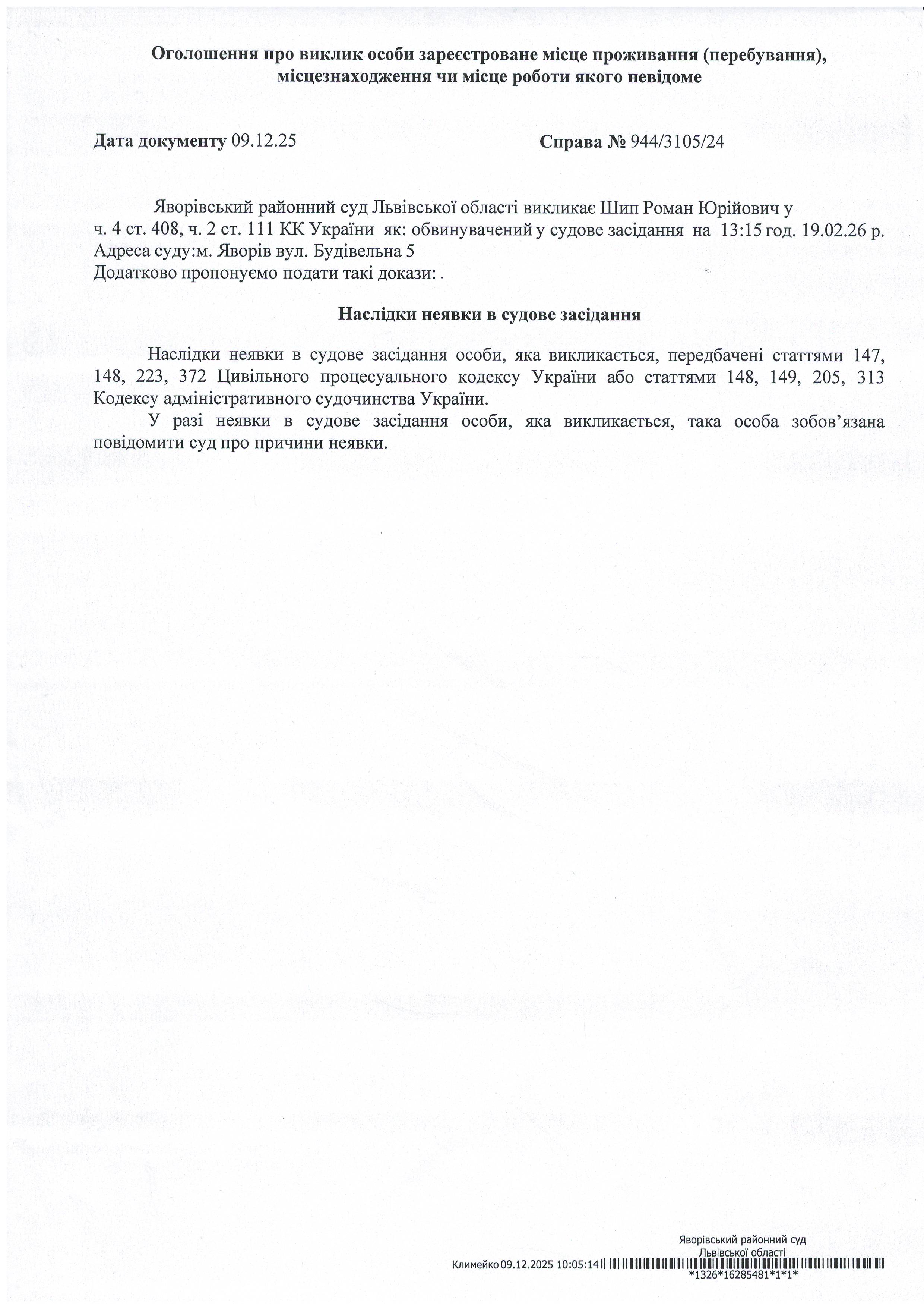 Виклик в якості відповідача Шип Романа Юрійовича
