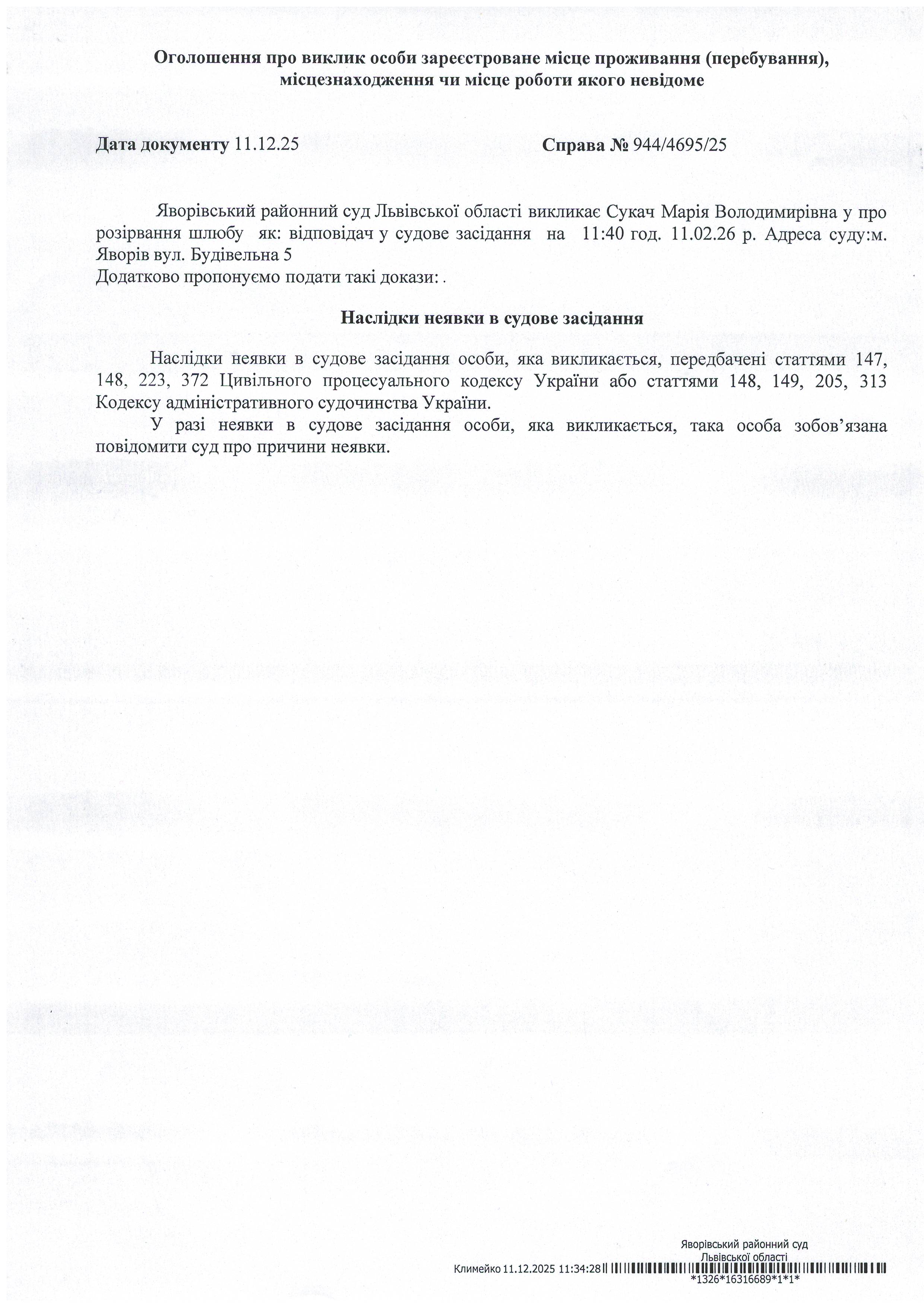 Виклик в якості відповідача Сукач Марії Володимирівни