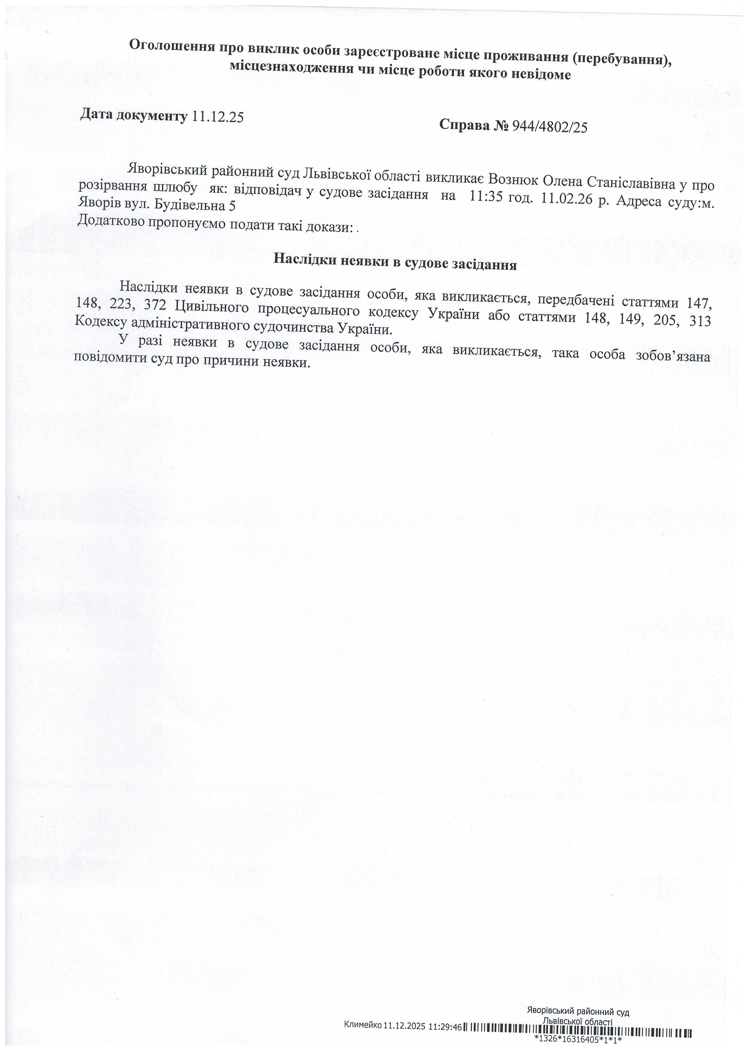 Виклик в якості відповідача Вознюк Олени Станіславівни