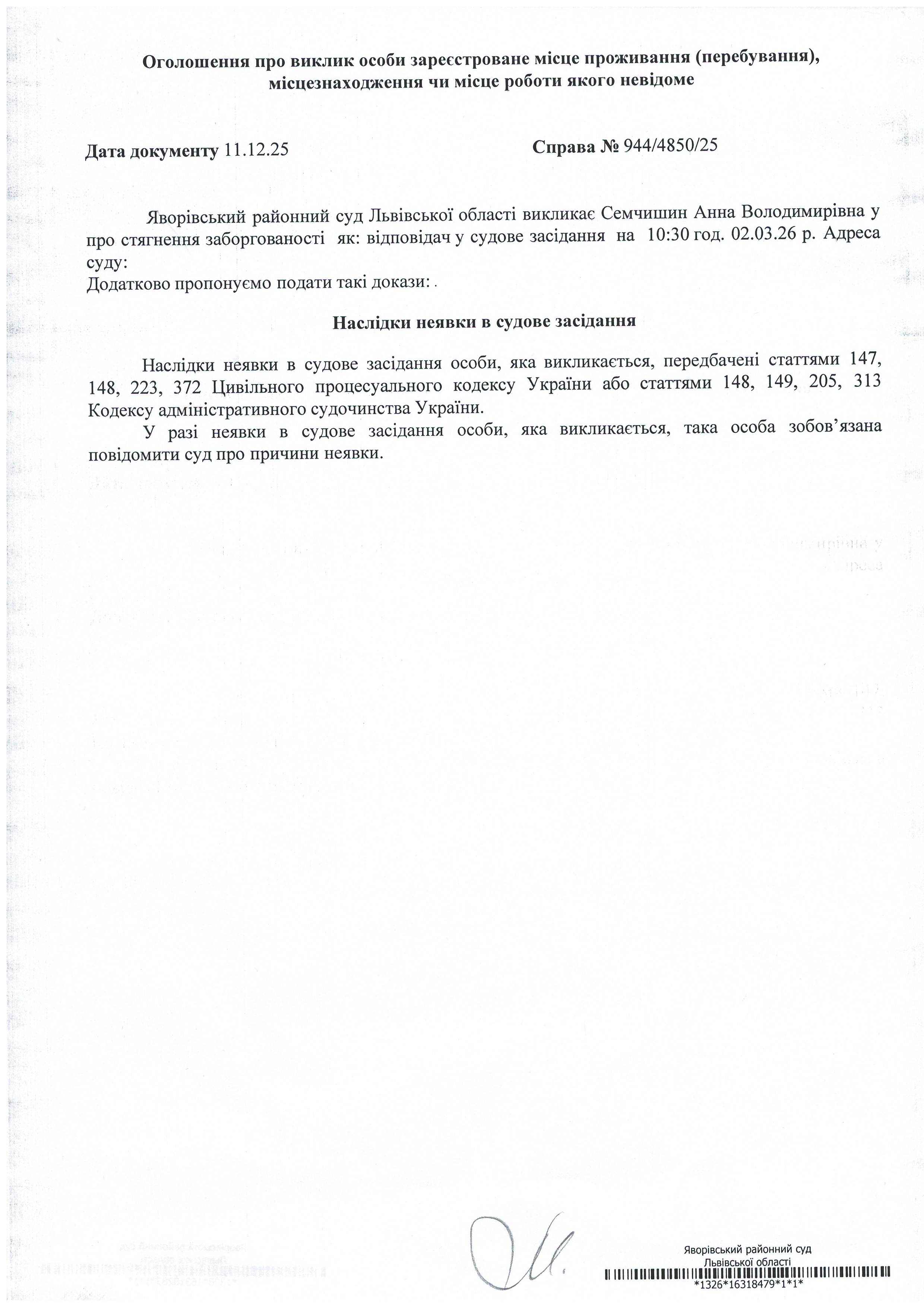 Виклик в якості відповідача Семчишин Анни Володимирівни