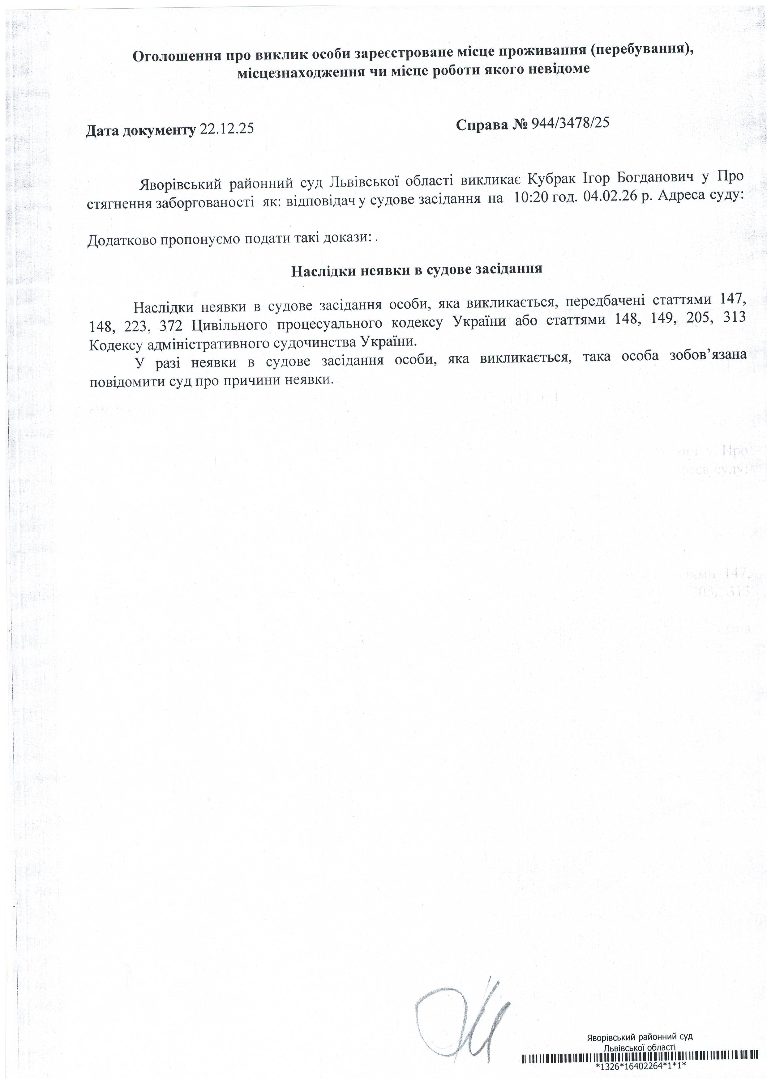 Виклик в якості відповідача Кубрак Ігоря Богдановича