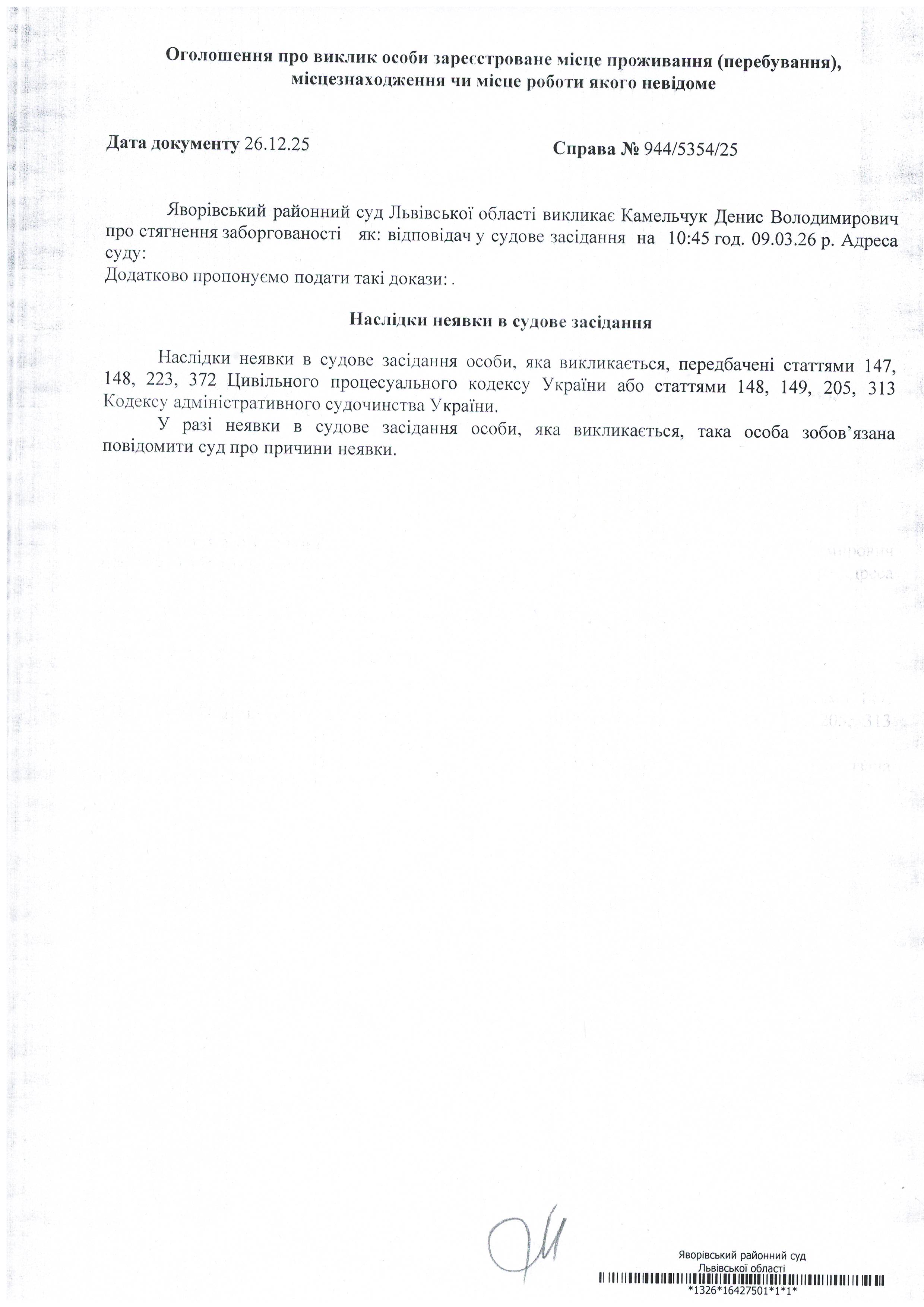 Виклик в якості відповідача Камельчук Дениса Володимировича