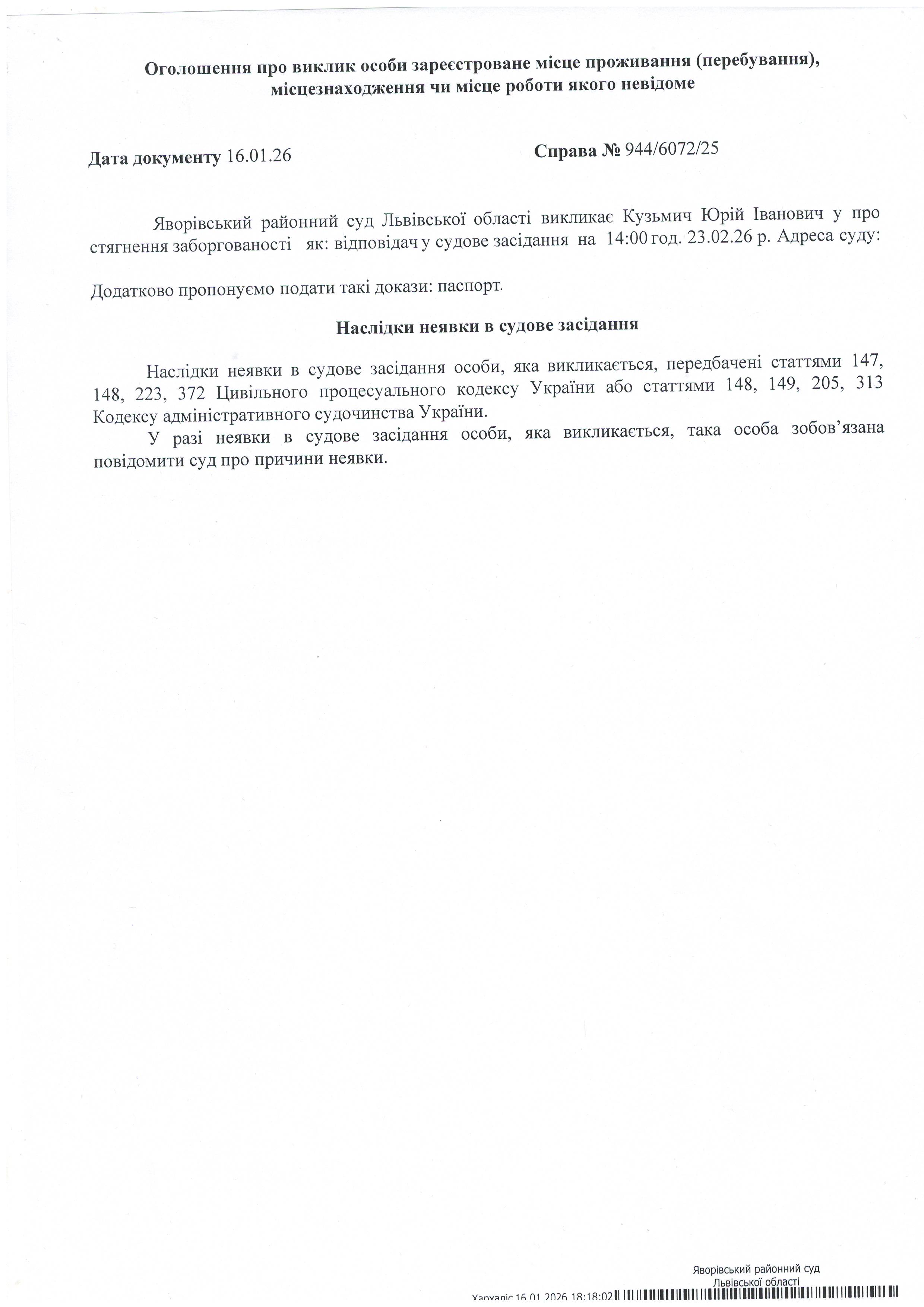 Виклик в якості відповідача Кузьмич Юрія Івановича