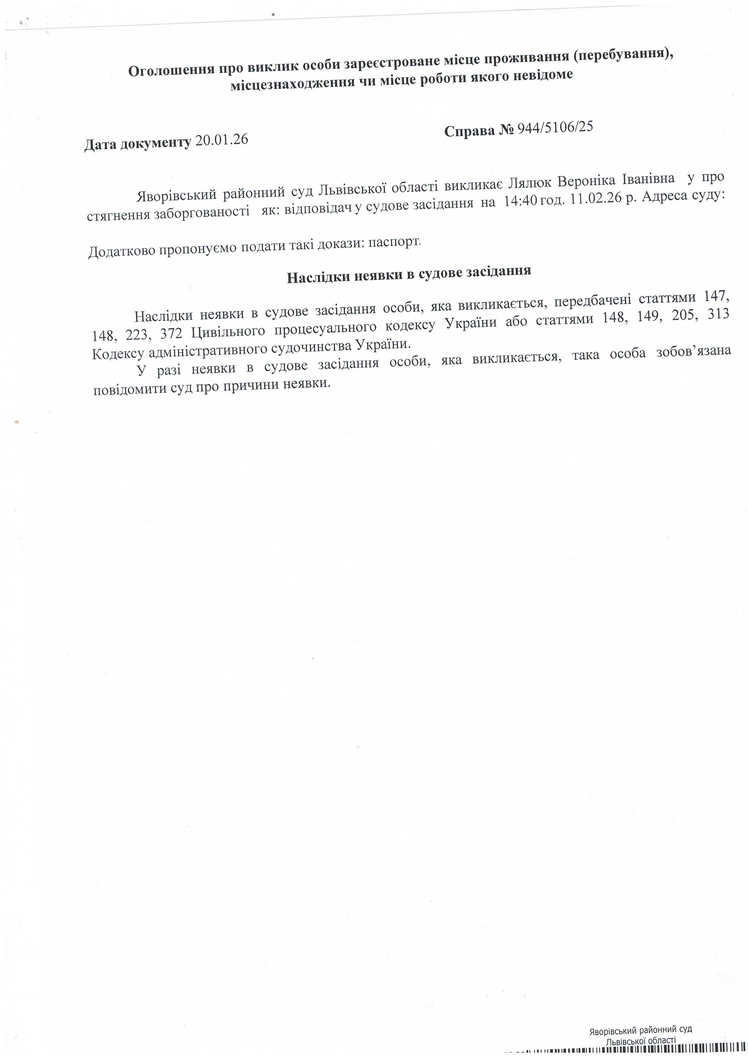 Виклик в якості відповідача Лялюк Вероніку Іванівну