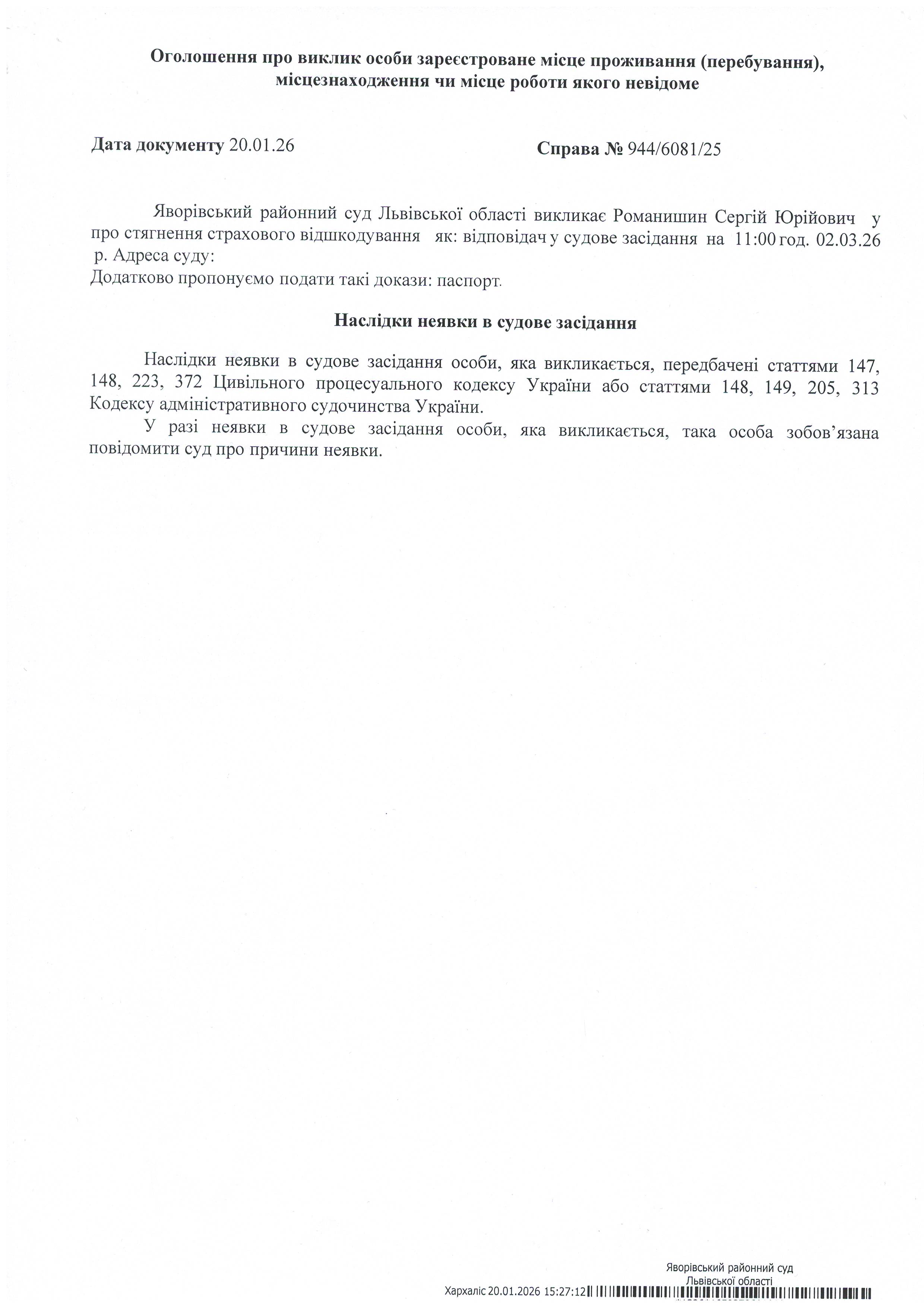 Виклик в якості відповідача Романишин Сергія Юрійовича