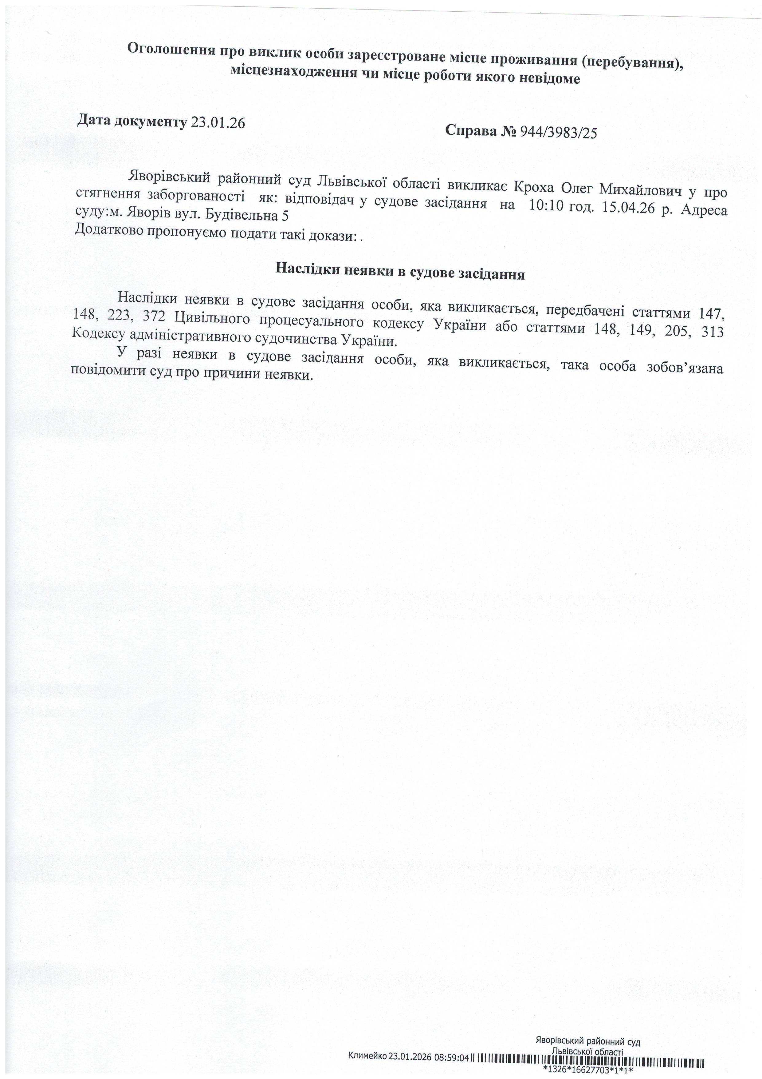 Виклик в якості відповідача Кроха Олега Михайловича