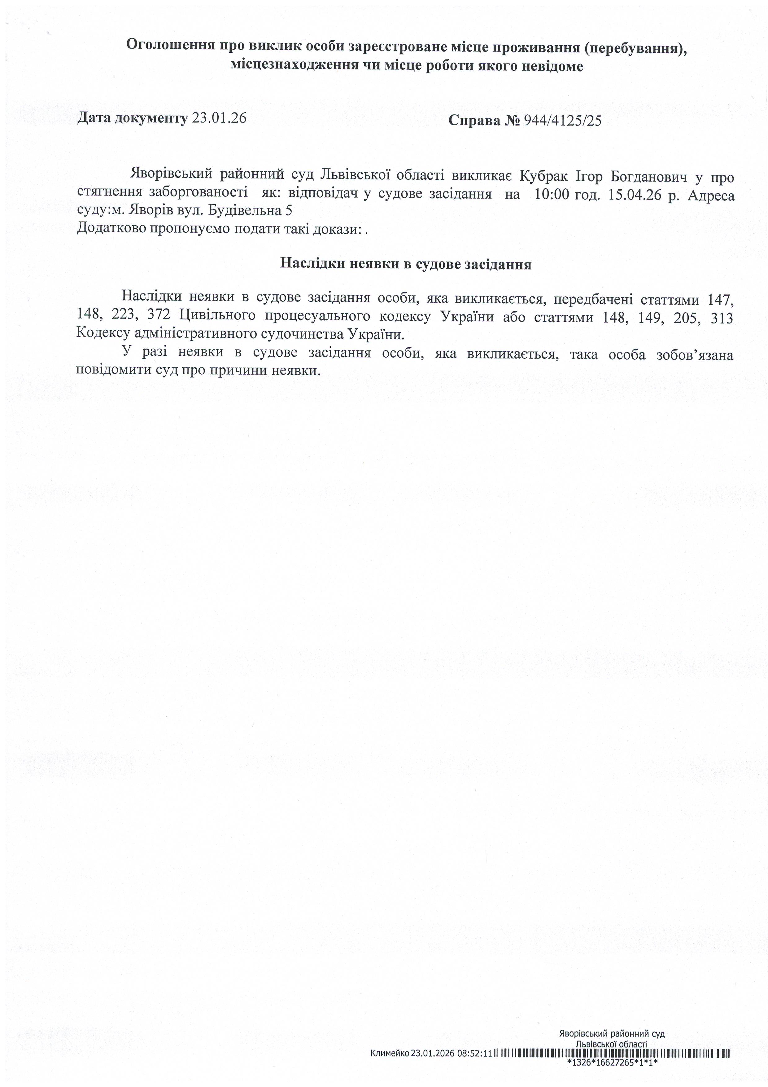 Виклик в якості відповідача Кубрак Ігоря Богдановича