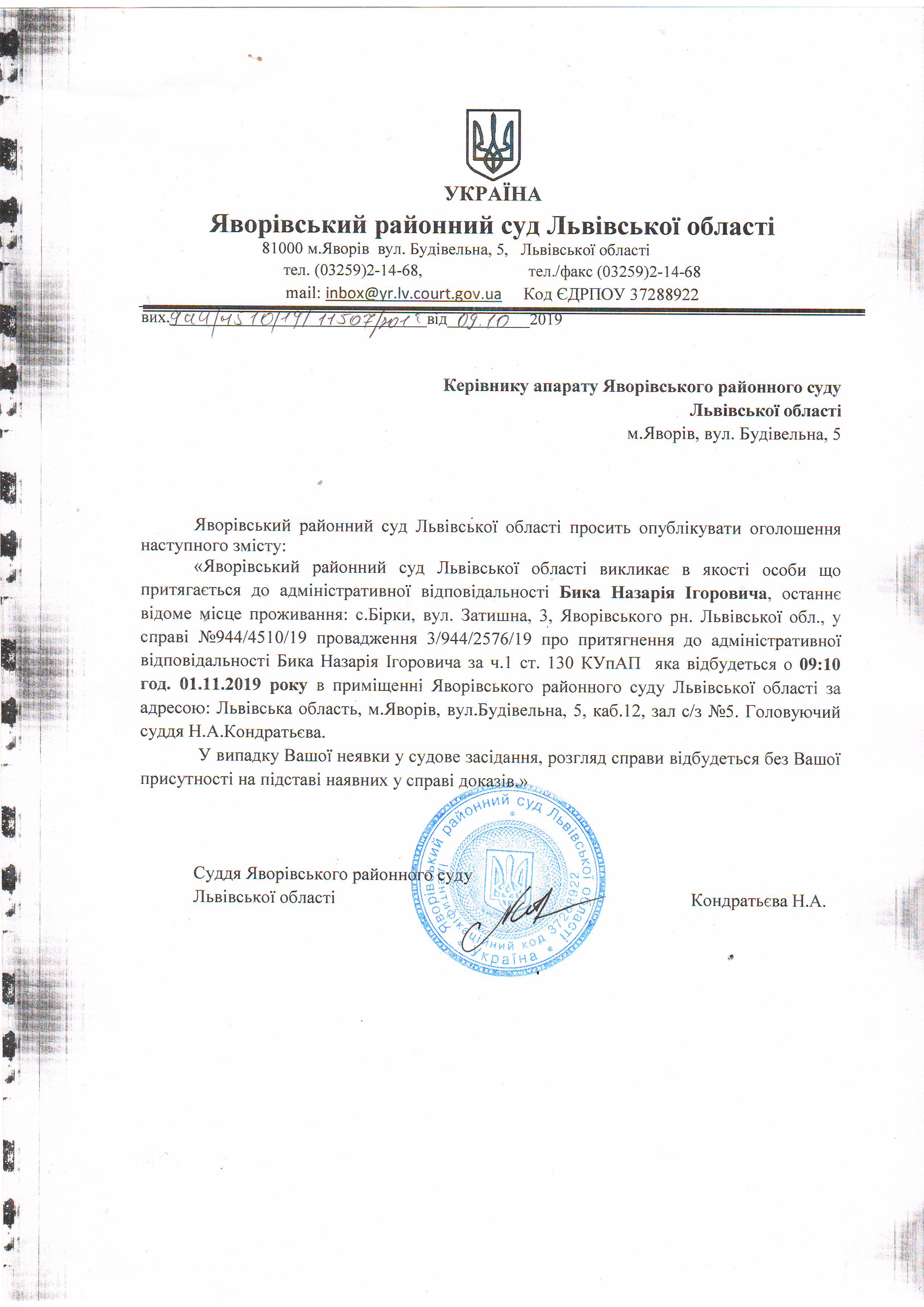 Виклик у судове засідання в якості в якості особи що притягається до адміністративної відповідальності Бика Назарія Ігоровича