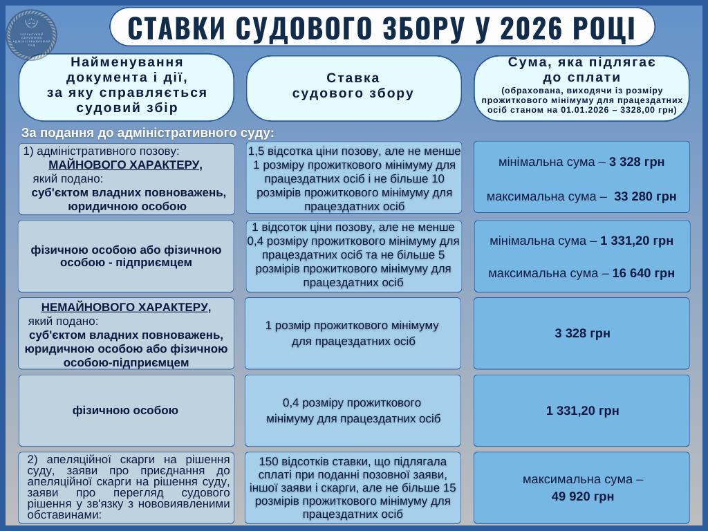 З 1 січня 2026 року прожитковий мінімум для працездатних осіб становить 3328 грн (ст.7 Закону України «Про Державний бюджет України на 2026 рік»).